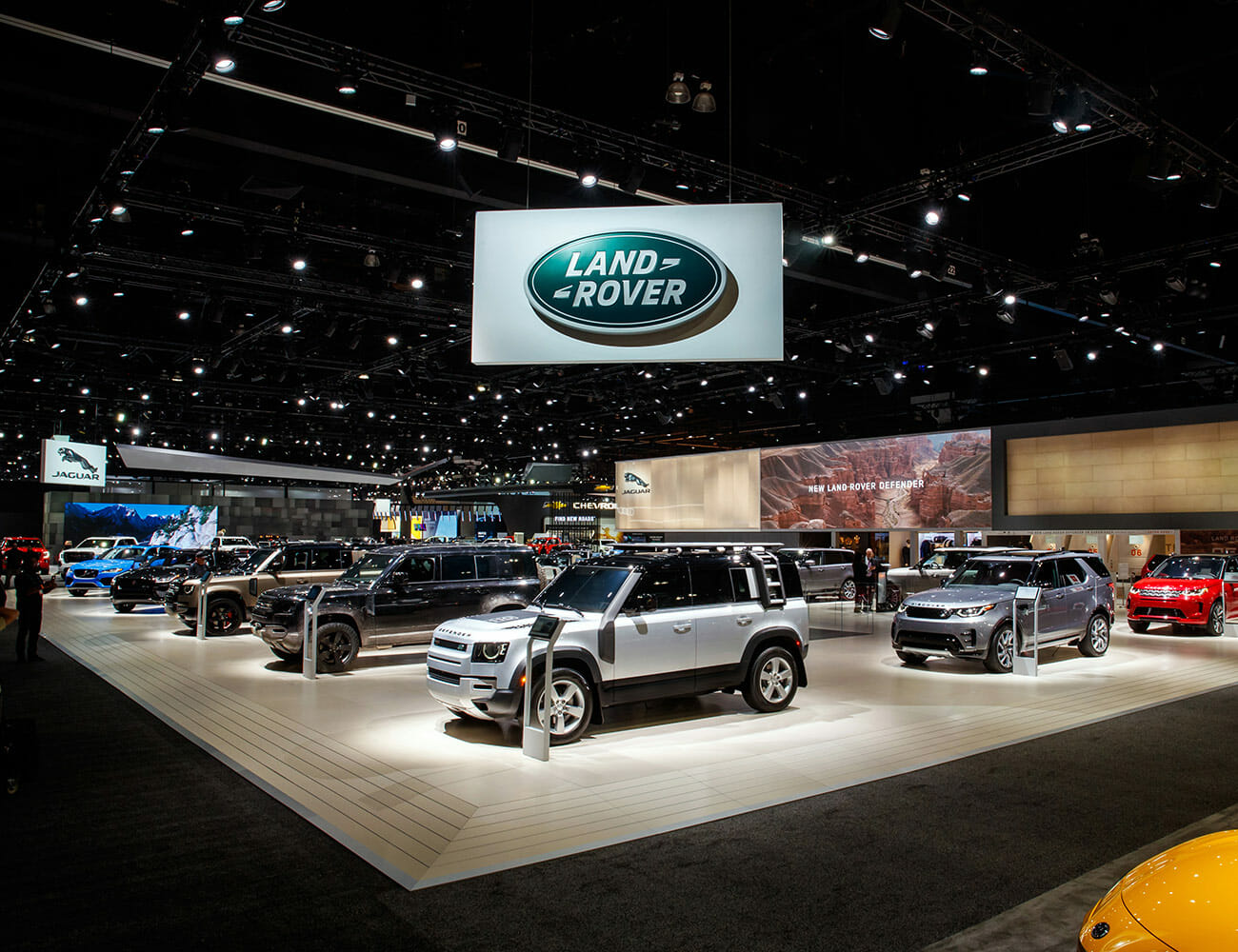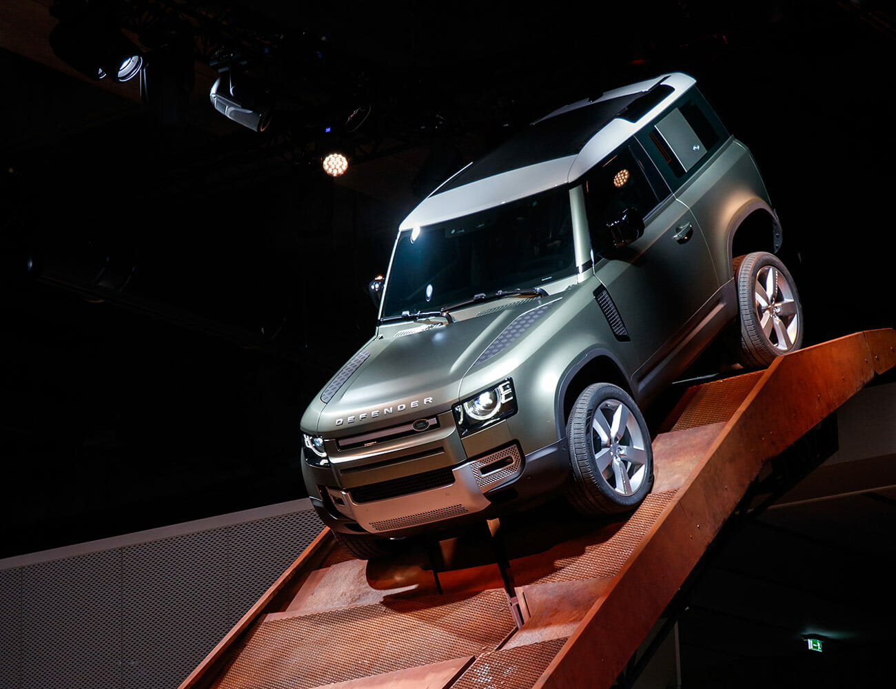 The Land Rover Defender in its starring role at the Jaguar Land Rover booth at the 2019 Los Angeles Auto Show