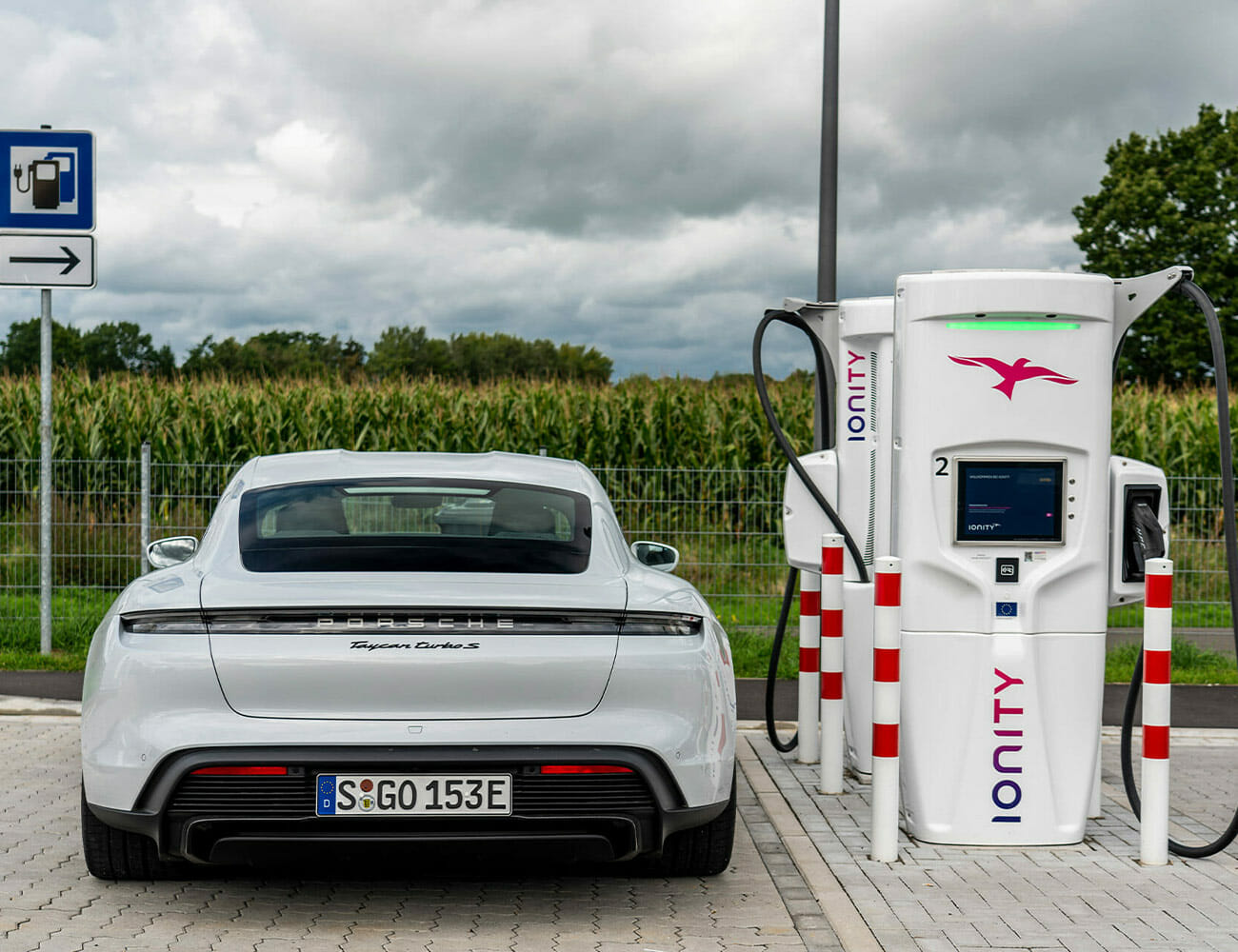 A Porsche Taycan at an Ionity charging station. Ionity is a cross-European charging network.