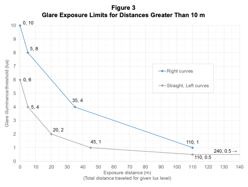 Thanks to the IIHS’s thoroughly, ridiculously comprehensive guide to its headlight testing procedures, we know that the agency says “the maximum glare for 5-10 [meters] should not exceed 10 lux” while “the glare illuminance for the remainder of the approach (i.e., 10-120 m for curves and 10-250 m for the straightaway) should not exceed the cumulative exposure distance limits shown in Figure 3.” (Figure 3, for what it’s worth, is the chart below.)