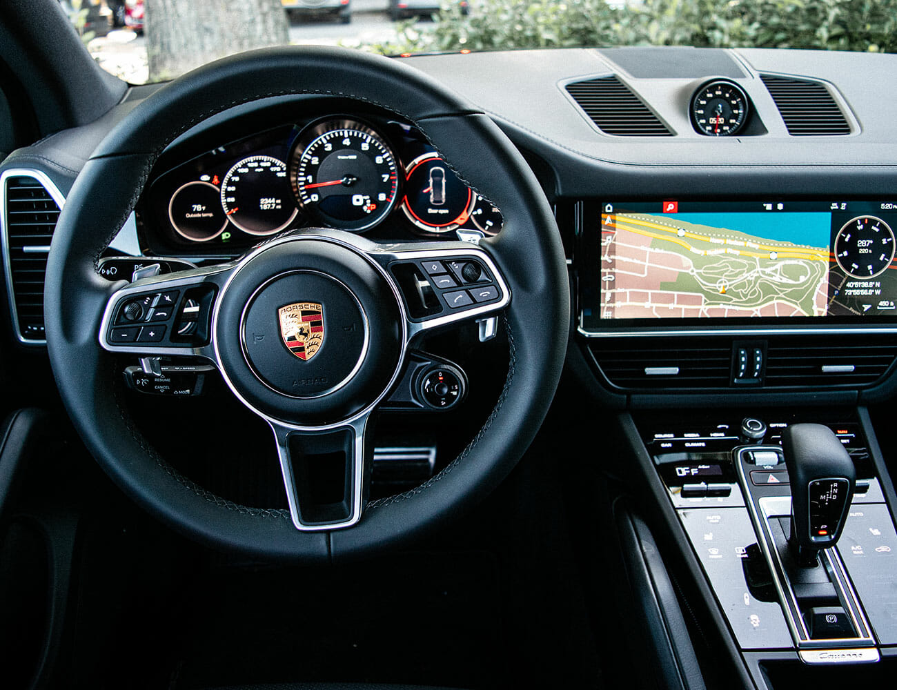 Branded as the Grand Touring version, the hybrid packs a 13.6-kWh lithium-ion battery that increases power, but, along with the additional hybrid hardware, adds about 800 pounds. You don’t notice it, though. Nor do you notice the overall mass slowing down even the conventional V6 version; it moves just as smoothly and authoritatively, helped along by a silky 10-speed transmission.