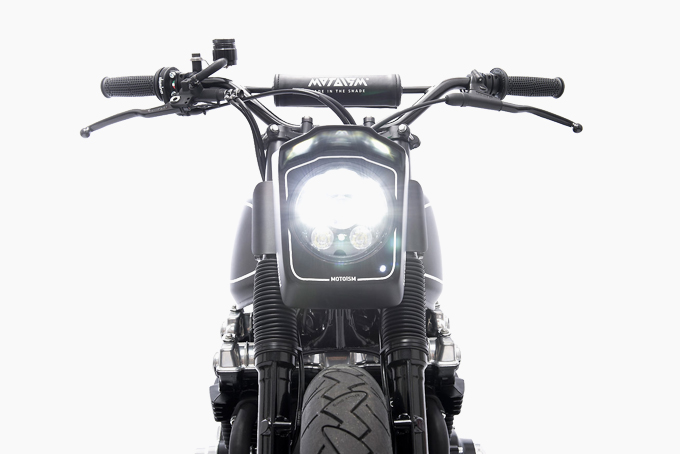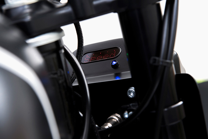With nitrous injection system, the Honda Starrider gains an additional 7.7 horsepower. That’s small enough to remain within TÜV regulations. The bike also boasts a carbon fiber headlight nacelle with an LED lamp. But actually, you can crank that up to 23 horsepower. The bottle hides underneath, as do much of the electrics. There’s a Bluetooth-powered Motogadget module to control the electronics, as well.
