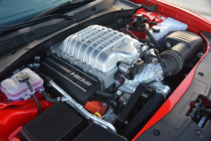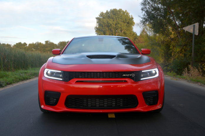 Dodge delivered a Redline Pearl example with twin black racing stripes to us. It looked meaner than the 392. I don’t know if it was the deep, sharp splitter or the huge cold-air intake on the wide hood flanked by enormous heat vents, but something about it seemed to emanate serious speed. Maybe it was the large twin exhaust pipes sticking out from beneath the tail. Or the chrome Hellcat badges on the flanks. Maybe it was all those little clues rolled up into one serious-looking speed wagon.