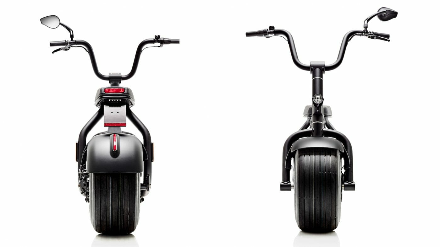 The motor draws power from a removable 36V 20,000 mAh battery that fully charges in just four hours. Users can select from four driving modes: Comfort, Sport, Hand, and Eco. Zip around in style with speeds up to 15.5 mph. The rear wheel uses a mechanical disc brake, while the front is equipped with a hydraulic unit. To keep the Scrooser looking slim, the batteries are hidden under the footboard.