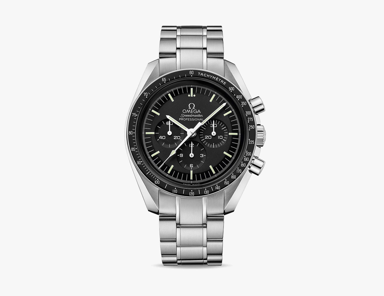 One of the most iconic wristwatches of all time, the Omega Speedmaster is the watch that accompanied American astronauts to the moon. The modern Speedmaster Professional harkens back to the late 1960s models with its Hesalite acrylic crystal, manually-wound 1861 movement and 42mm case.