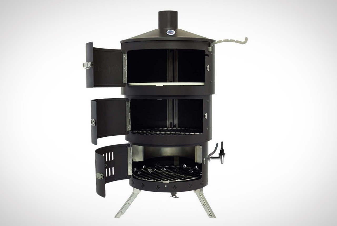 The beautifully crafted portable stove is made of 430 stainless steel and features a base that sits on adjustable tripod legs and works as a standalone grill, boiler, and fire pit. The second section allows you to raise the grill for frying food in a pan or wok, while the enclosing top section is an oven with a baking stone, insulated lid & thermometer, with plenty of space for cooking a casserole or a whole chicken.