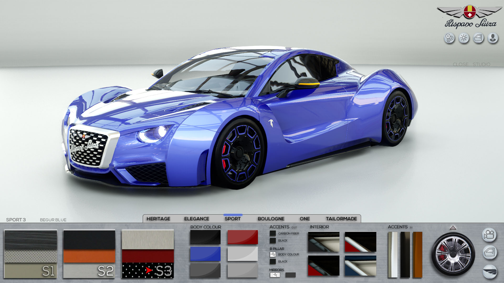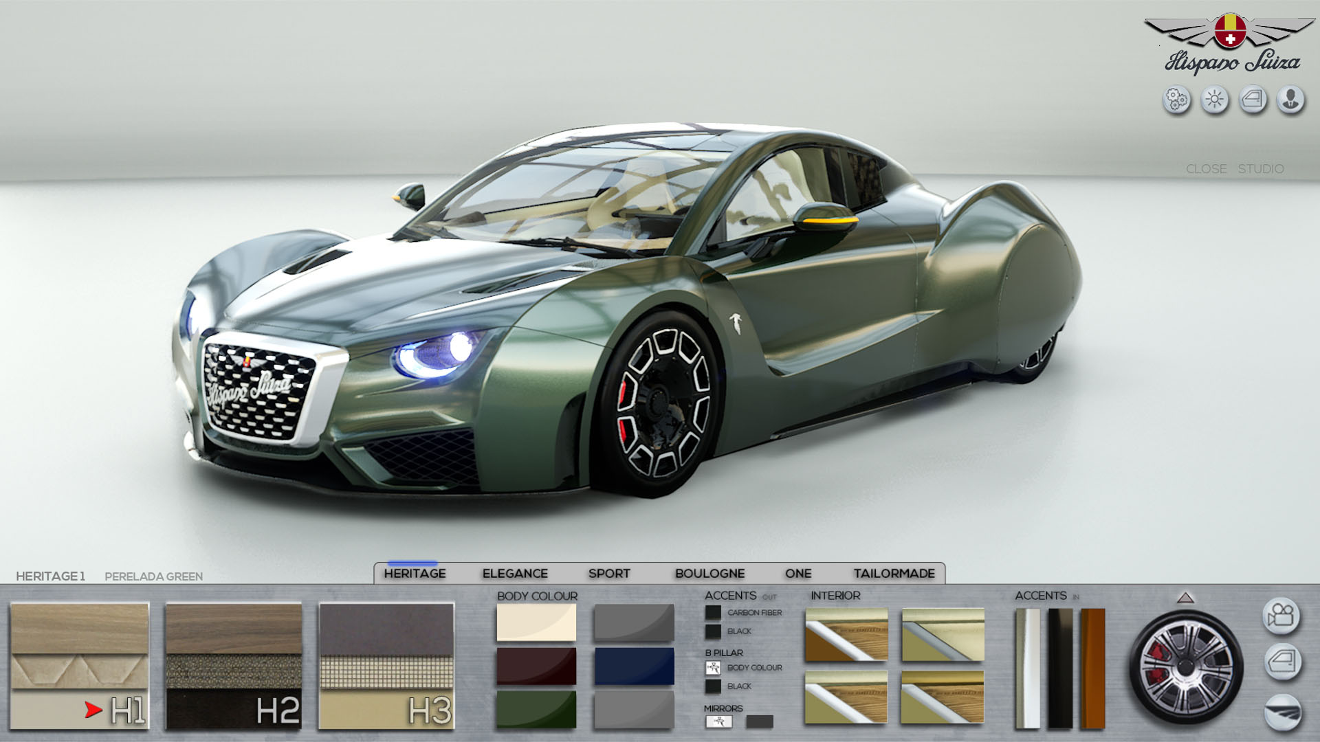 Hispano Suiza Carmen BoulogneClients can choose between three main configurations that reflect the key values of the brand’s DNA – Elegance, Heritage and Sport – and, based on these, they can choose different colors and materials for the interior and exterior of their car, to add a personal touch to the design and adapt it to their individual tastes. Colors have been chosen and named in a tribute to the history of the brand, and include Peralada Green, Swiss Red, Xenia Gray, Birkigt White, or Begur Blue, among others.