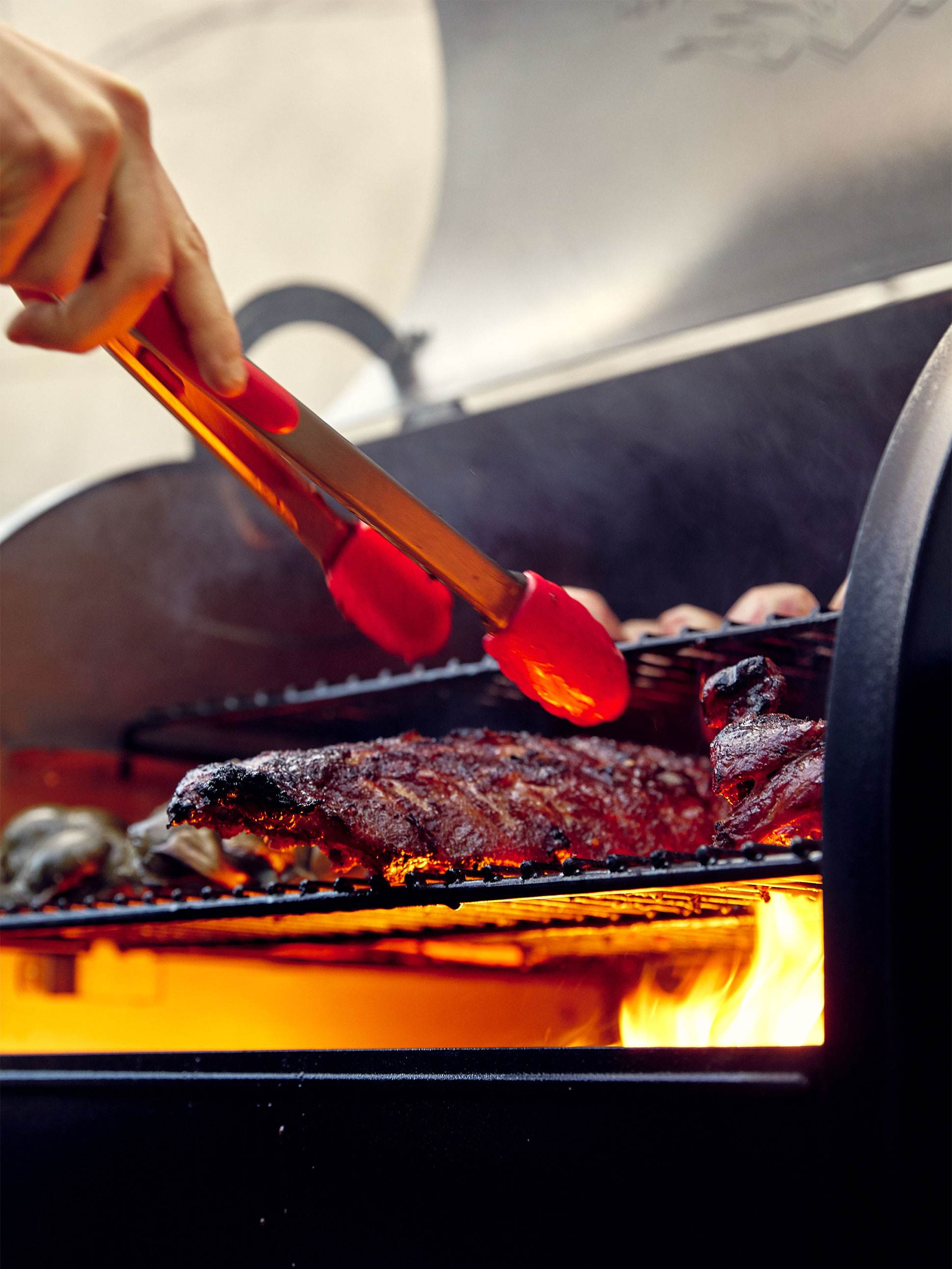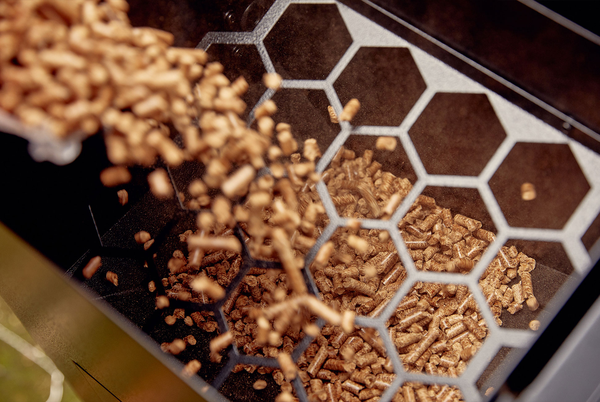 It used to be that pellet grilling was for nerds. Invented in the ’80s by a guy who owned a heating company in Oregon, wood pellet grills are powered by electricity and fueled by wood pellets. An auger pushes compressed wood from a holding chamber on the side of the grill to a fire pot under the grates, where a temperature gauge and a fan work together to maintain a stable heat.