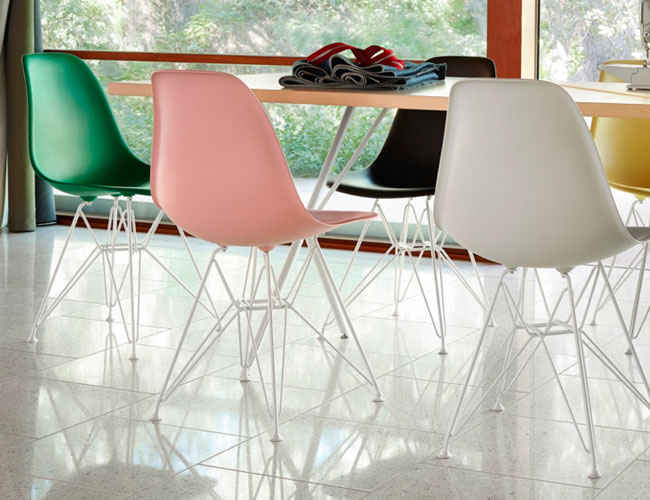 Charles and Ray Eames released the molded fiber glass chair in 1950. Unlike the majority of chairs back then, it was deliberately shaped to allow the user remain comfortable in a variety of seated positions. In the early 2000s, Herman Miller sought to update the Eamses economic design with more sustainable materials, replacing fiber glass with polypropylene, a fully-recyclable thermoplastic known for durability and versatility. The modernized Eames chair comes with wood or metal legs.
