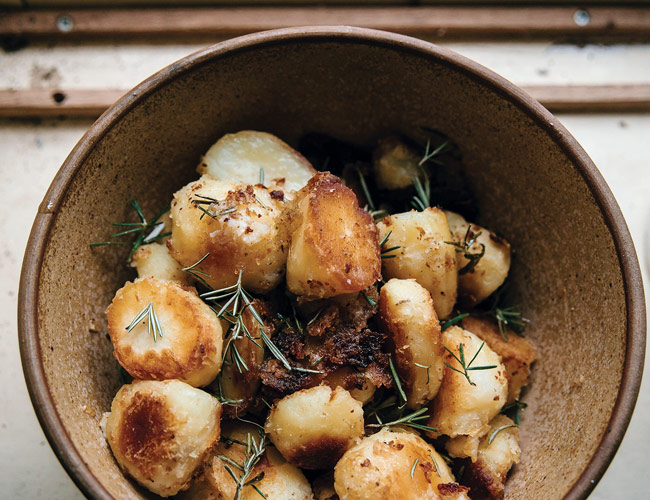 To prevent damaging a knife, Lau splashes his sharpening stone with water constantly before and after a round of sharpening. A sign you’re in good shape: grey sediment building up in the water on top of the stone after a few swipes of the blade. “That stuff is abrasive and helps you sharpen more efficiently,” Lau says. “Don’t wash it off.”