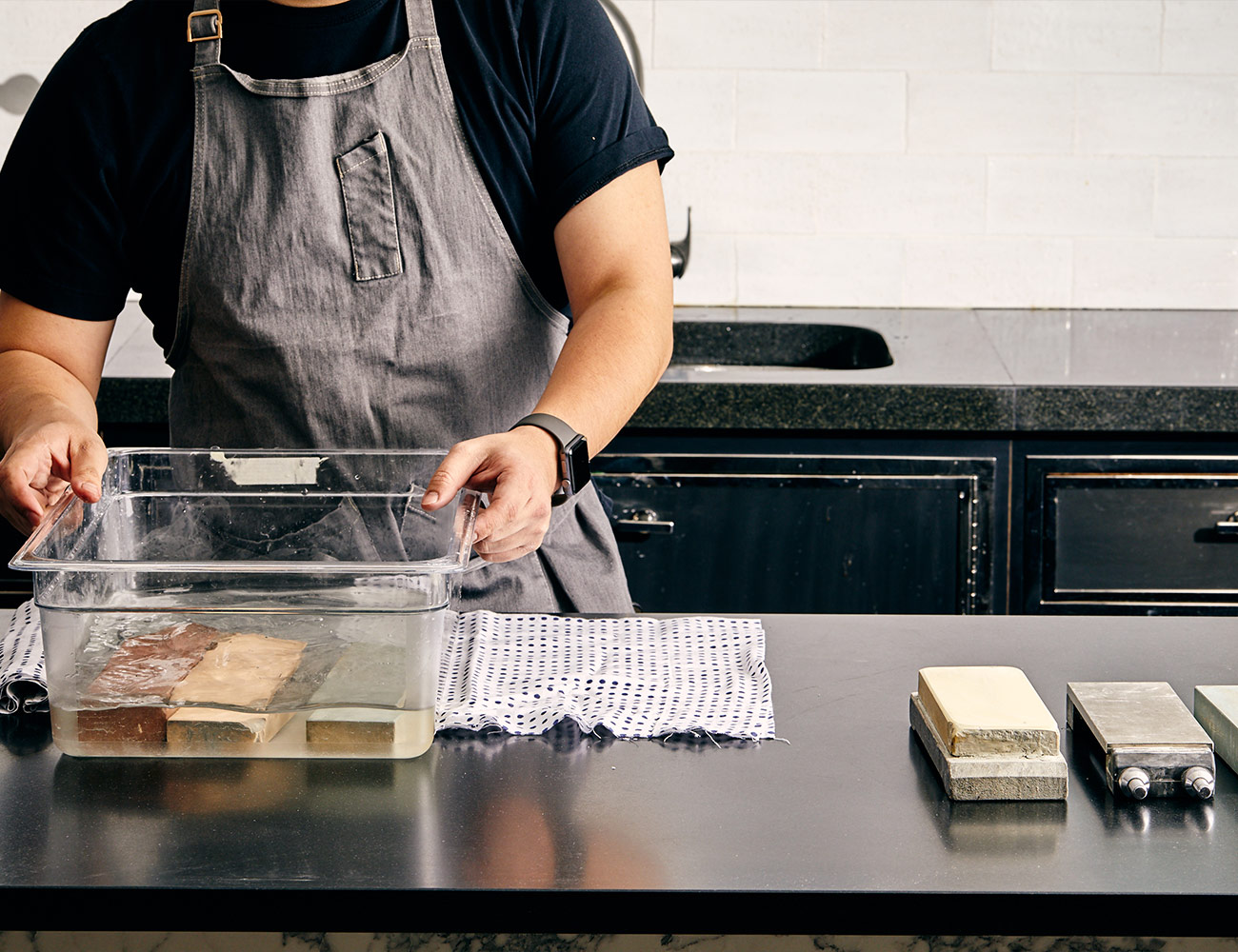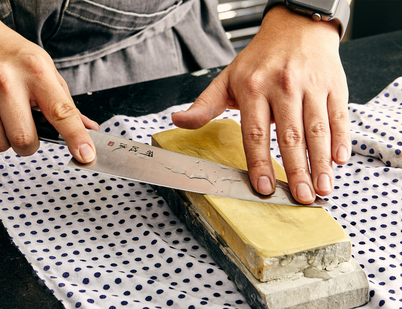 Soaking the stone before sharpening ensures the surface of the stone won’t scratch or chip the blade further. According to Lau, it is a non-negotiable step in the knife sharpening process. “I’d soak them for at least 15 minutes or so before getting to work,” he says. “Half an hour would be ideal.”