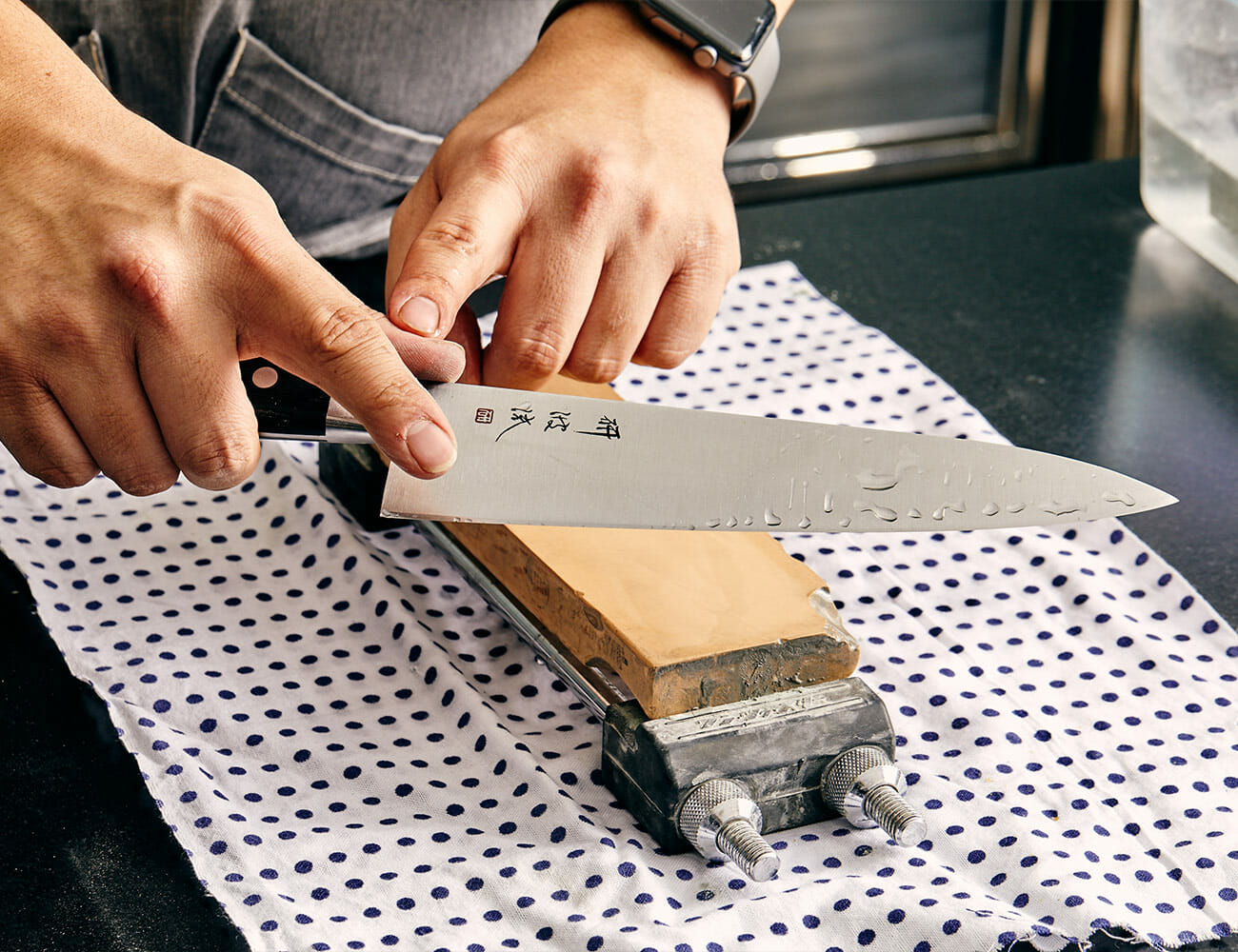 Once you’ve got the angle down, it’s time to create a new edge. Lau recommends getting comfortable with the motion and pattern of sharpening before working on your first knife. In theory, the process is quite simple: keep the knife against the stone with two fingers and pull the blade towards you, then push it away.