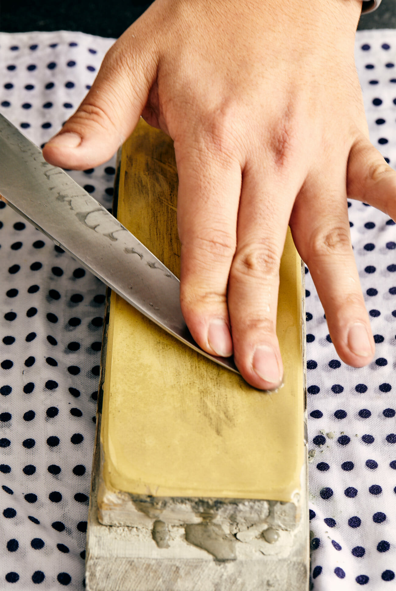 Lau says to make sure the tip of the knife doesn’t miss sharpening, too, as the optimal sharpening angle for the rest of the blade can create a gap between stone and tip. To counteract this, simply lift the elbow of your grip hand while sharpening the tip area — this will lower it onto the stone.