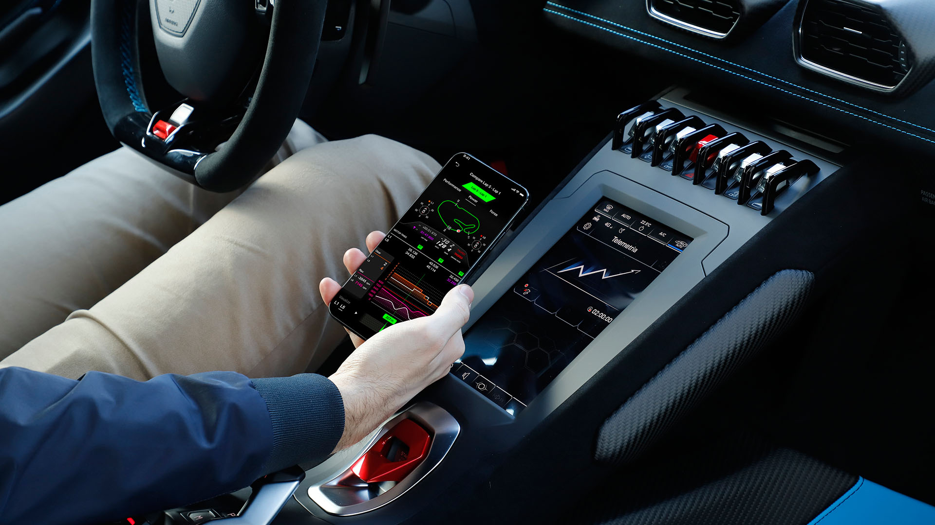 The cockpit is very driver oriented with all relevant controles either mounted on the steering wheel or directly in reach without the need to take your eyes of the road. To add to the sense of experience you have to flip a red cover up to expose the start button and fire up the engine. Once you do the heavy base tone of the V10 fills the cabin. In Strada mode the Huracan is pretty quiet but once you switch to the sport or track modes it will become impossible to have a phone call and the V10 completely immerses you with all the emotions it has to give.