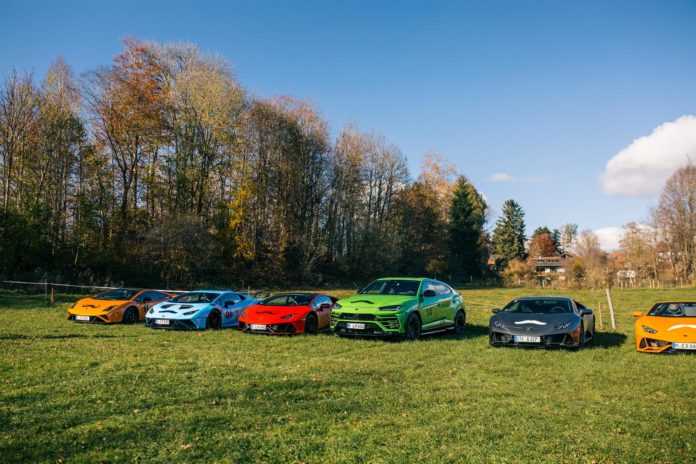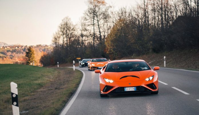 On this early Saturday morning in November the cold air penetrates my clothes as I walk to the Lamborghini dealership in Munich. The Lamborghini flags outside wave in the light breeze. But the sky is blue and the sun is about to pop-up from behind the surrounding buildings. The parking lot is already filled with ‘Bulls’ – from ‘my’ Huracan EVO RWD to several Huracans, Aventadors and a brand new Huracan STO that will be the lead car for today’s drive.