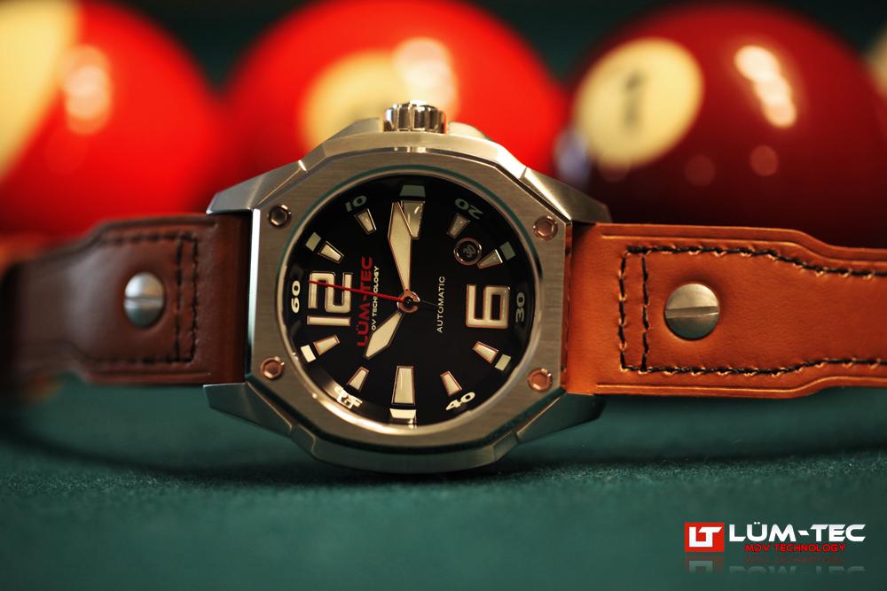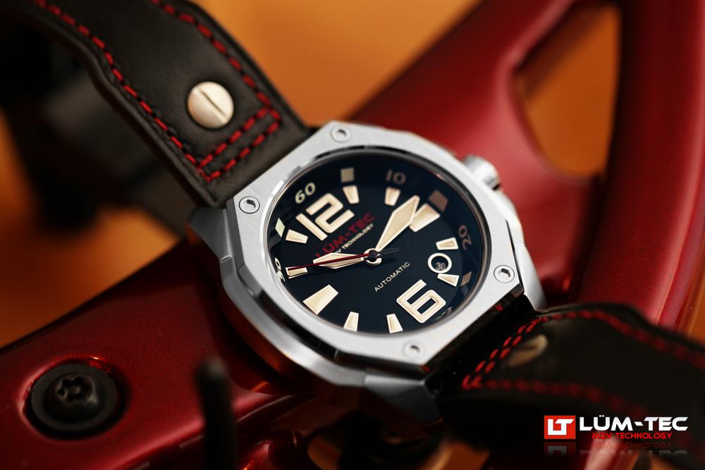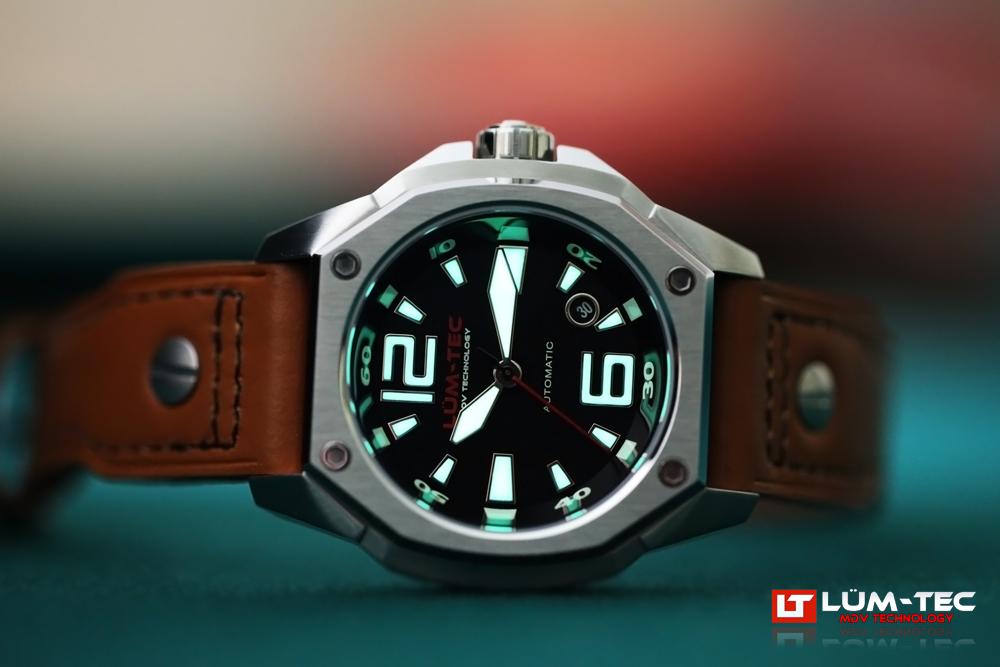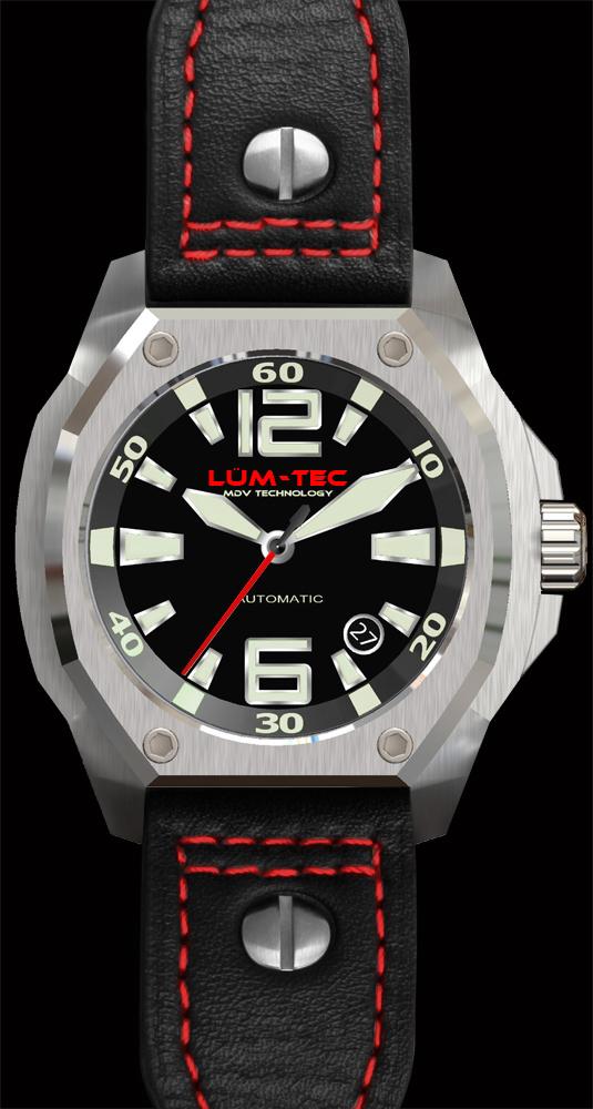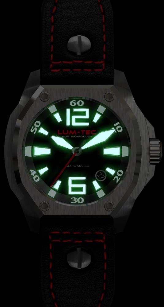 The V1 comes with 3 straps in Red stitched black leather, brown leather and molded rubber. 316L stainless steel with alternating brushed and high polished finishes. Fully decorated and upgraded ETA 2824-2 automatic movement with hacking and handwinding features. +/- 0-3 seconds/day accuracy. Features Sapphire crystal with double side anti-reflective coating, threaded sapphire display caseback (with same double side AR coating as front sapphire) and LUM-TEC MDV Technology®.