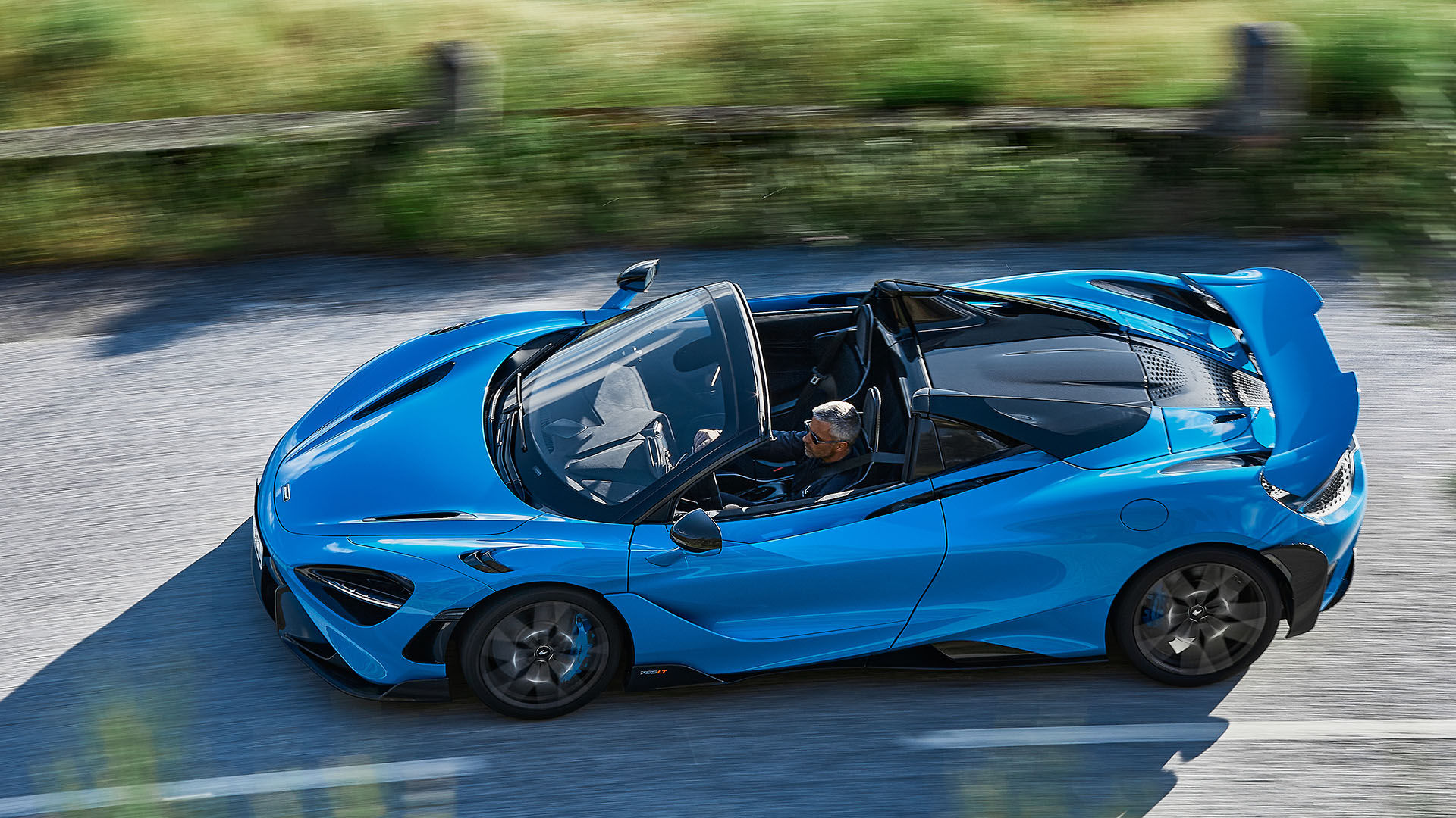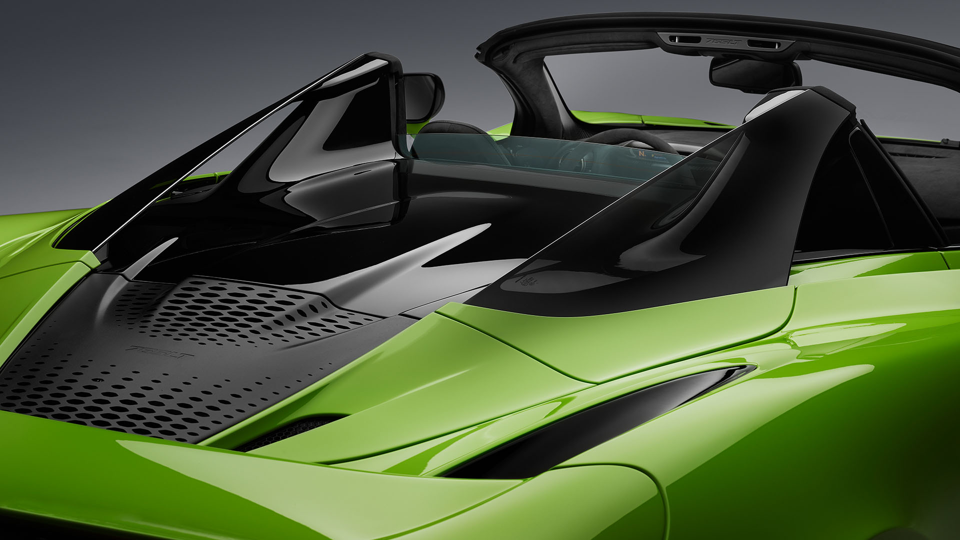 Despite being a hardtop convertible, the windshield does not need to be extended above the occupants as seen on many open-top cars with a rigid roof, using a single piece carbon fiber roof also increases headroom thanks to no seam needed above your head, and when closed the entire structure is stronger than ever thanks to it being all carbon fiber from front to back … for the Spider version McLaren did have to reprogram the active rear wing to counteract the difference in airflow with the roof in place compared to when driving topless.