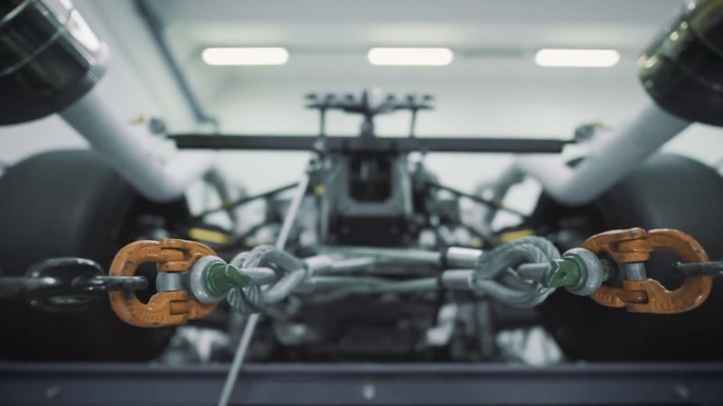 The rear wing stretches off the back of the car with sculpted carbon fiber endplates and seamlessly connects to the rear fender bodywork. The diffuser that emerges from the car’s underbody — creating low pressure by accelerating the airflow under the car for added downforce — is massive. The giant 325/705-19 Pirelli slicks are slightly exposed from behind, giving you the full sense of just how much rubber is on the ground, and the sharp edges of the center exit exhaust tips are already a bluish-purple tint.
