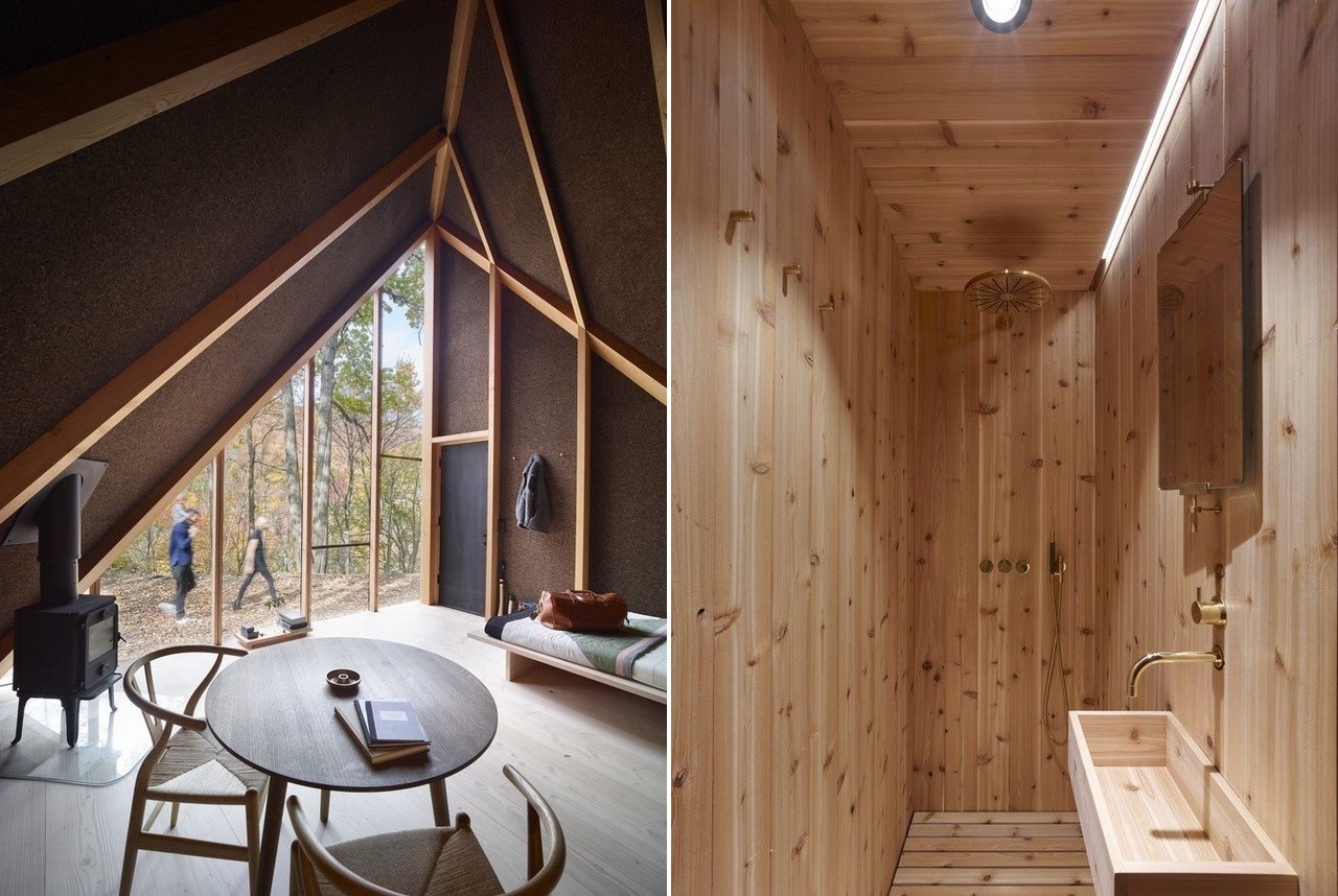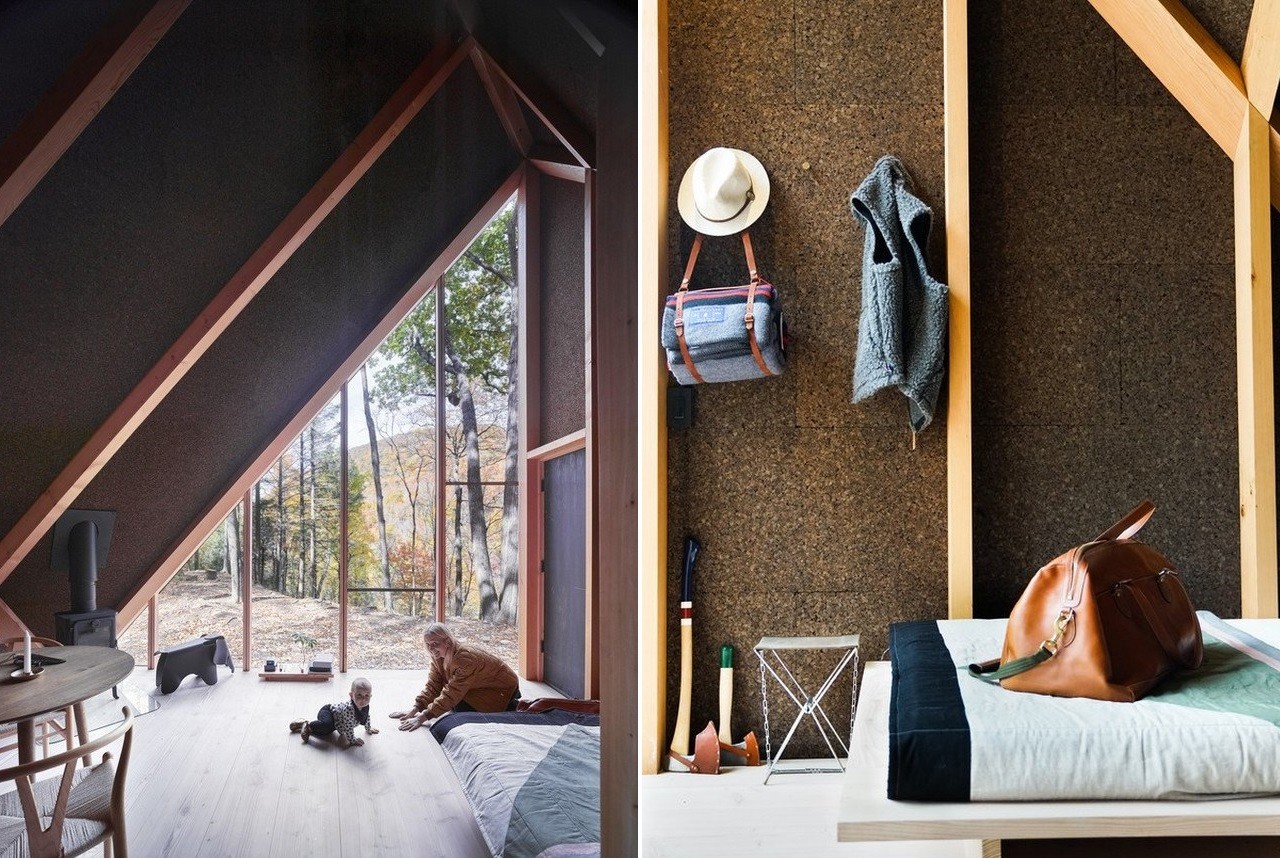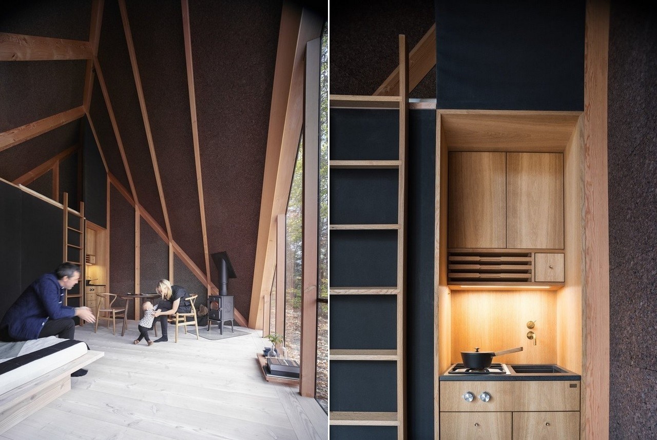 Inside, home owners are welcomed by a minimal Nordic design that brings nature inside through the use of an exposed timber-frame in solid pine, Douglas Fir floors, and space-grade insulating natural cork walls. A triangular floor-to-ceiling window, made of seven glass pieces, allows daylight to illuminate the interiors.