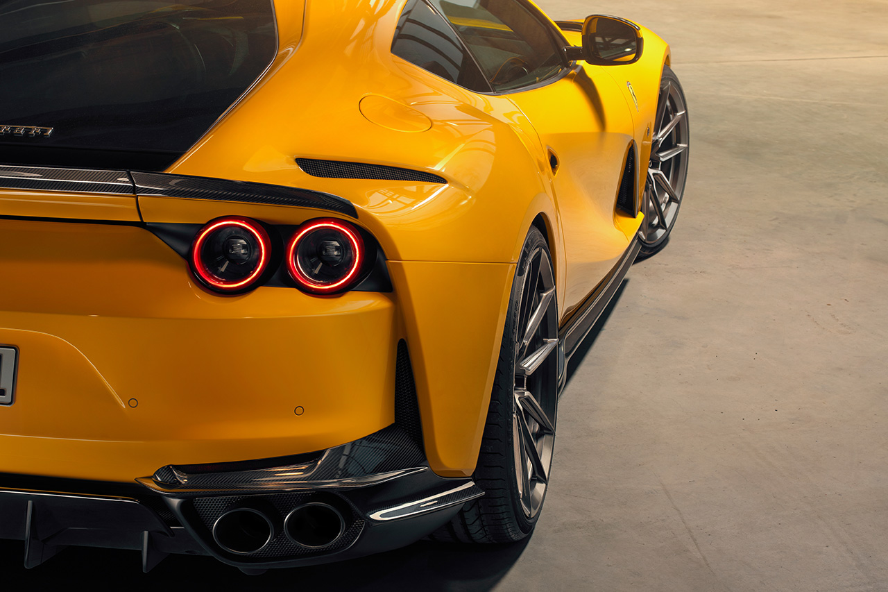 Same for the front fenders, the NOVITEC N-LARGO replacement units widen the standard Ferrari F8 Tributo by 7 cm and come with some stunning, clear carbon fiber vents above the wheels, in this case, massive 9.5×21-inch NOVITEC NF10 NL hi-tech forged wheels made in cooperation with Vossen in the United States, mind you the rear axle gets a staggered 12×22-inch wheel with five, extremely concave delicate twin spokes, tires are 255/30 ZR 21 and 25 ZR 22 respectively.