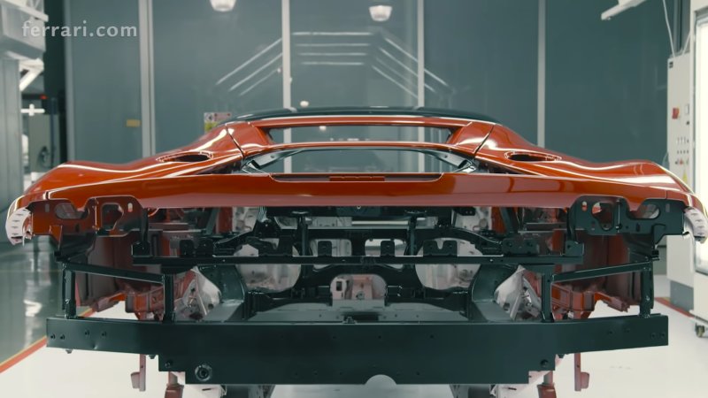 The video opens with a visit to the foundry, where molten aluminum is poured into molds and we see gloved hands and robots assembling parts for the 4.0-liter twin-turbo V8, its most powerful V8 yet at 769 hp. Ferrari says its engineers increased the capacity on the F154-heritage engine to 3,990 cc from 3,902 cc via a larger, 88-millimeter bore. There’s also a new, narrower cylinder head with a central injector, a Ferrari V8-first 350-bar GDI and a larger intake and redesigned exhaust system.