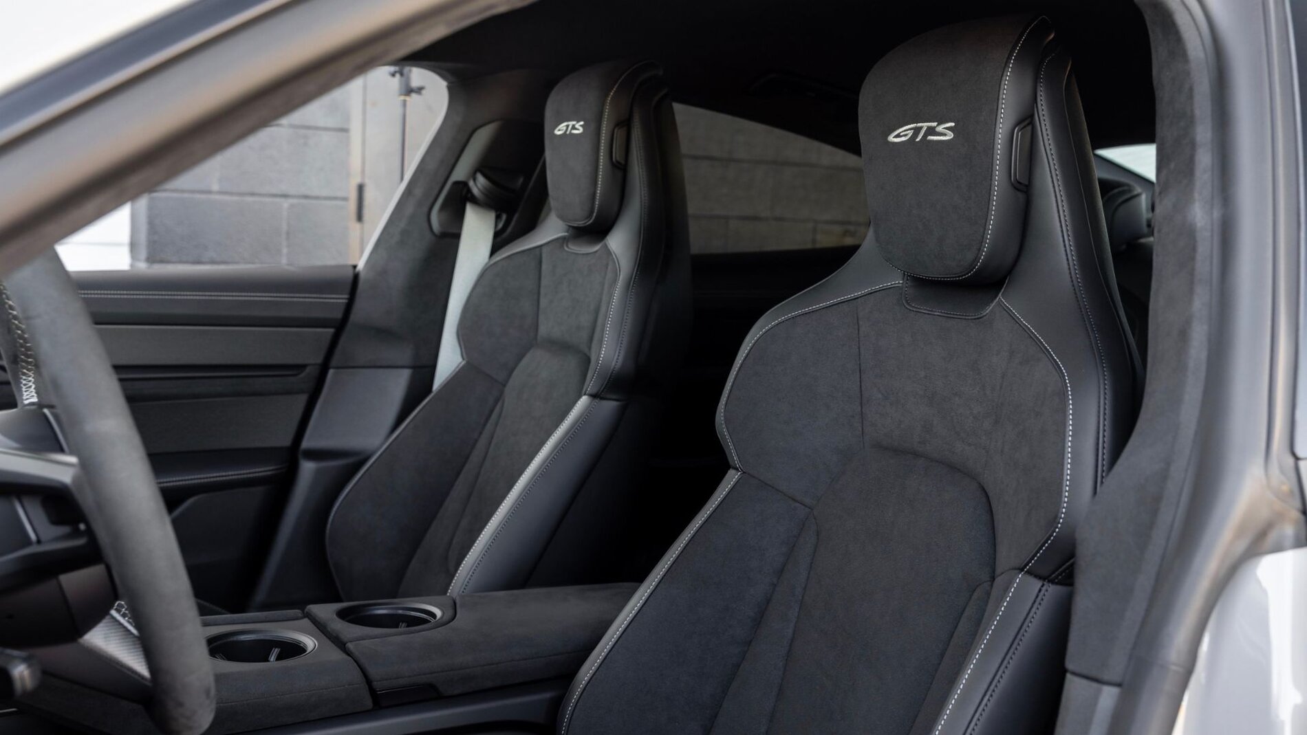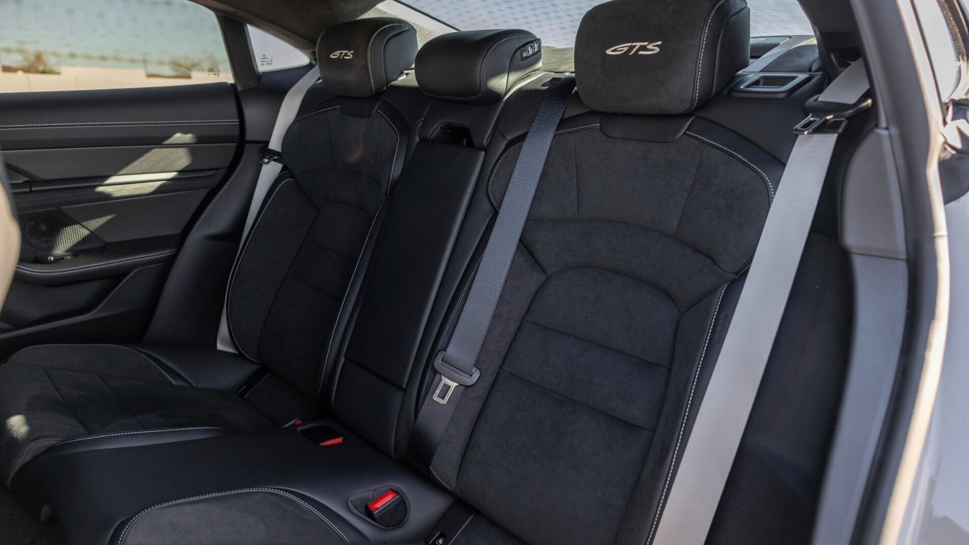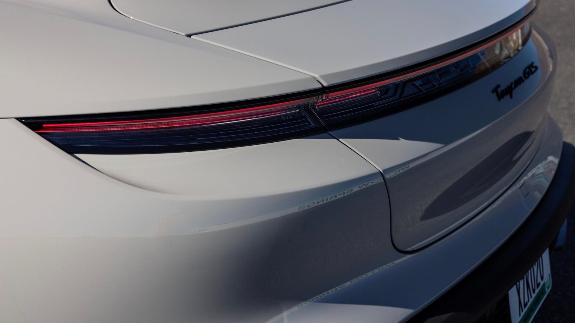 It’s all modern in back. A horizontal lattice supports thin, ornate LED taillights that bracket floating, illuminated Porsche logotype. When charging, the “E” pulses in white.
