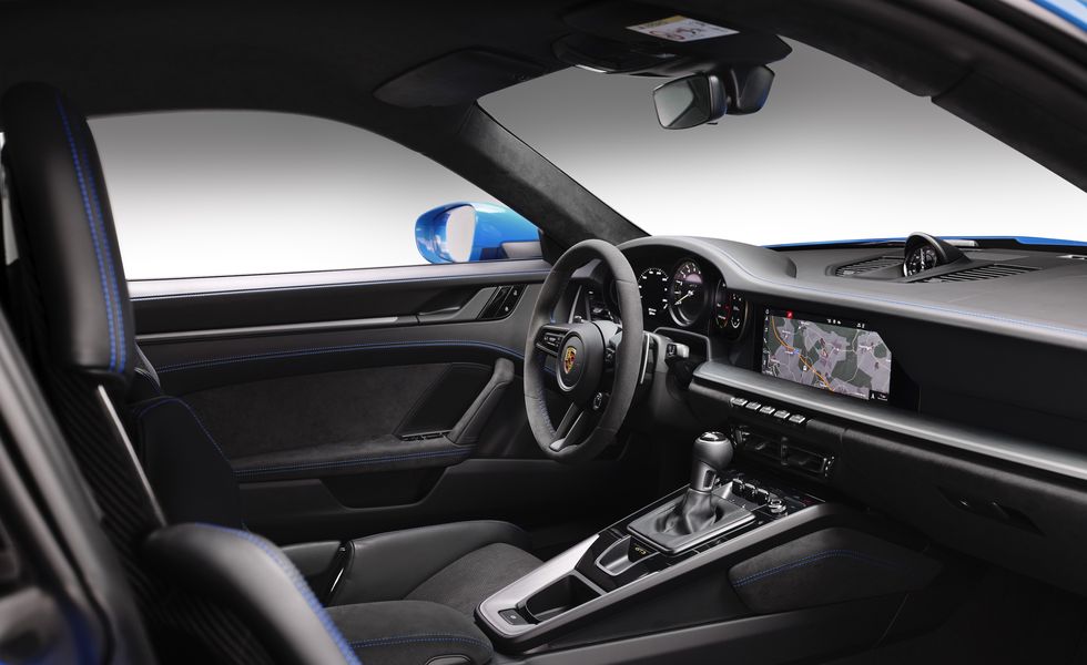 Its low weight of just 1,435 kg is achieved with a myriad lightweight components. This is includes a carbon-fiber hood, roof and rear wing, along with other items such as a super lightweight battery, lighter wheels, ultra-thin glass, carbon-fiber cross members, and lightweight interior appointments. Essentially, the 992 GT3 has achieved the same weight as its predecessor, but is loaded with a lot more technology.