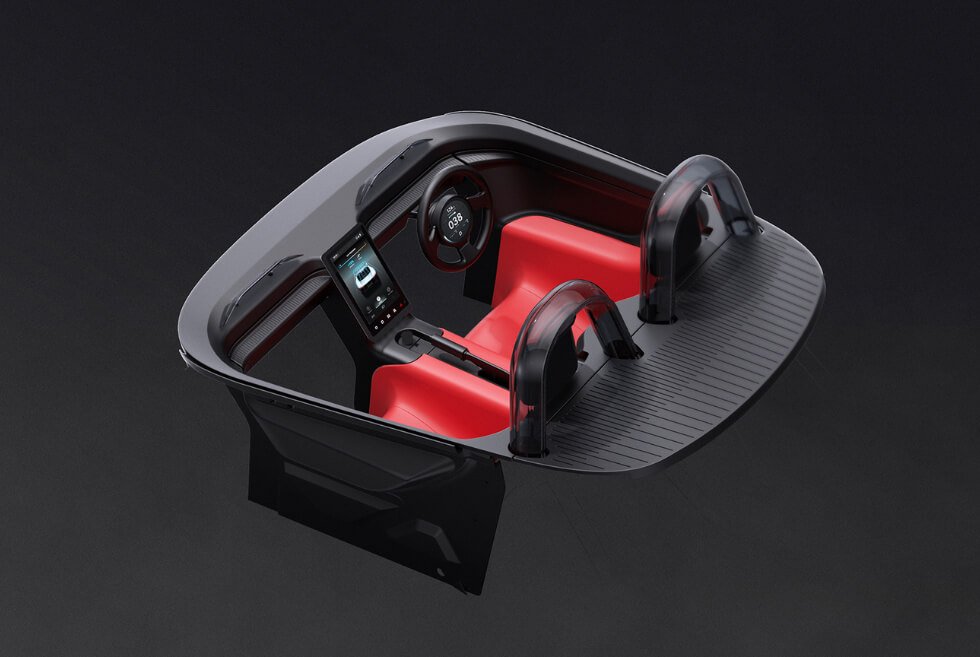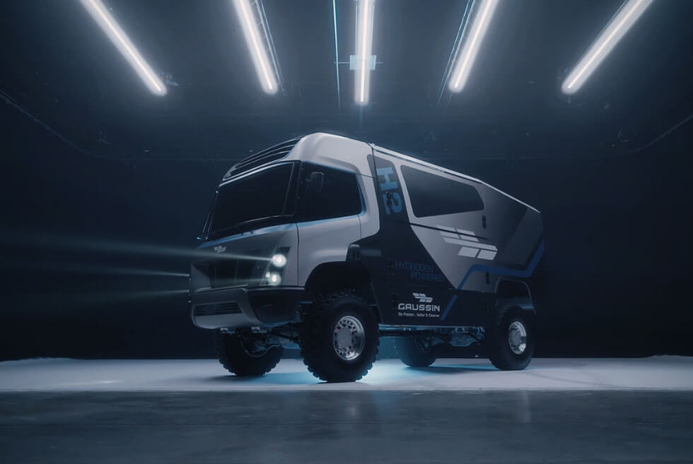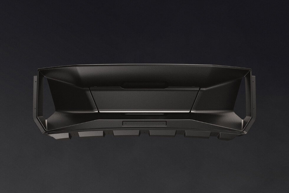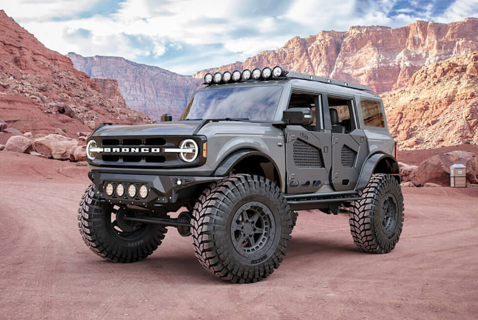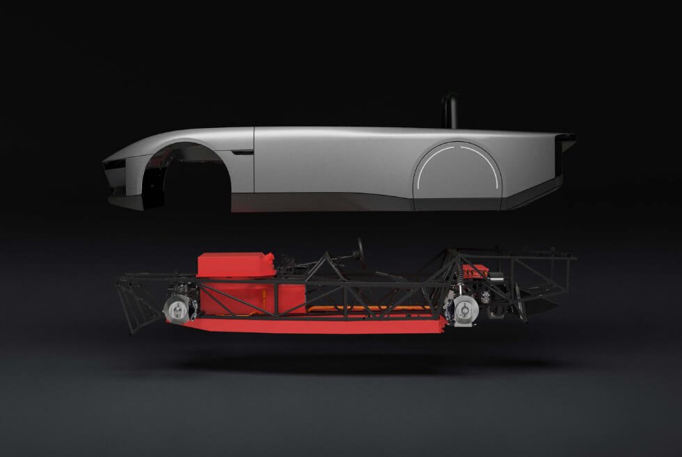 The vehicle’s exterior features a low-slung front end with hidden headlights and an aggressive grille design. It also has wide fenders, large rear tires, and dual tailpipes in the back.