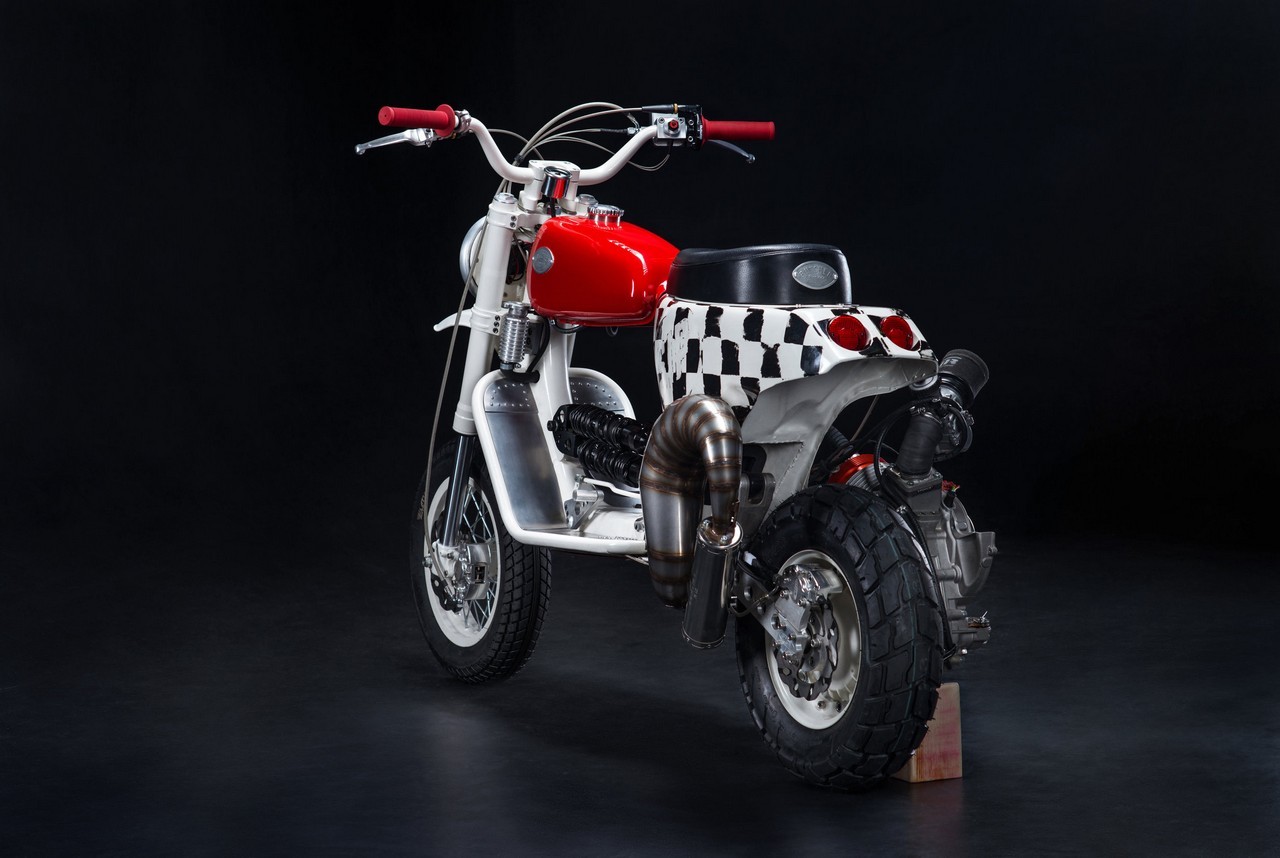 The lengthy list of upgrades also includes Fat Bars with Domino quick action throttle, a folding clutch lever, LED tail light, custom ‘curly’ exhaust tubes, plus new crankshaft, ignition, clutch and driveshaft. Finished in black, red and white with an ‘aged’ checkered rear section, this mad scooter has enough oomph to induce a permanent grin on the face of anyone brave enough to ride it.