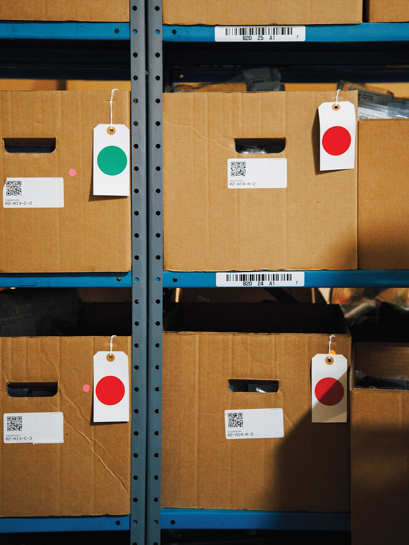 Trove doesn’t rely entirely on backend technological innovation. Sometimes there’s a more straightfor- ward solution — like hang- tags that communicate whether a bin is full (red dot) or has space remaining (green dot).