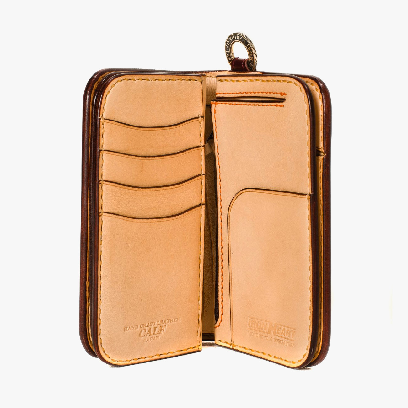 The eye-catching luster of the shell cordovan exterior is the first thing you’ll notice about Iron Heart’s Medium Wallet. Calf leather makes up the inner compartments which include a zipper coin pouch and several slots for cards and notes. It also includes a solid silver ring for attaching a wallet chain and it’s all sewn together using genuine coat achilles tendon.