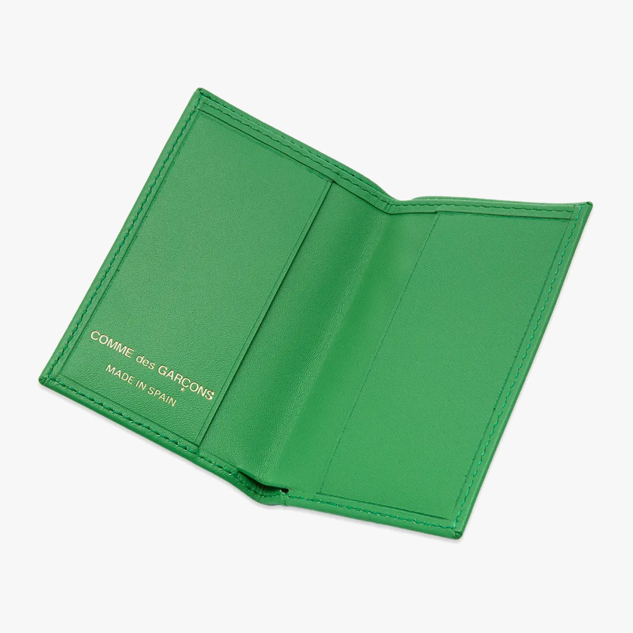 Cut from green Italian leather, this card holder features two exterior card slots and a central compartment for folded bills or other necessities. Relatively understated, the brand’s logo is embossed on the exterior of holder.