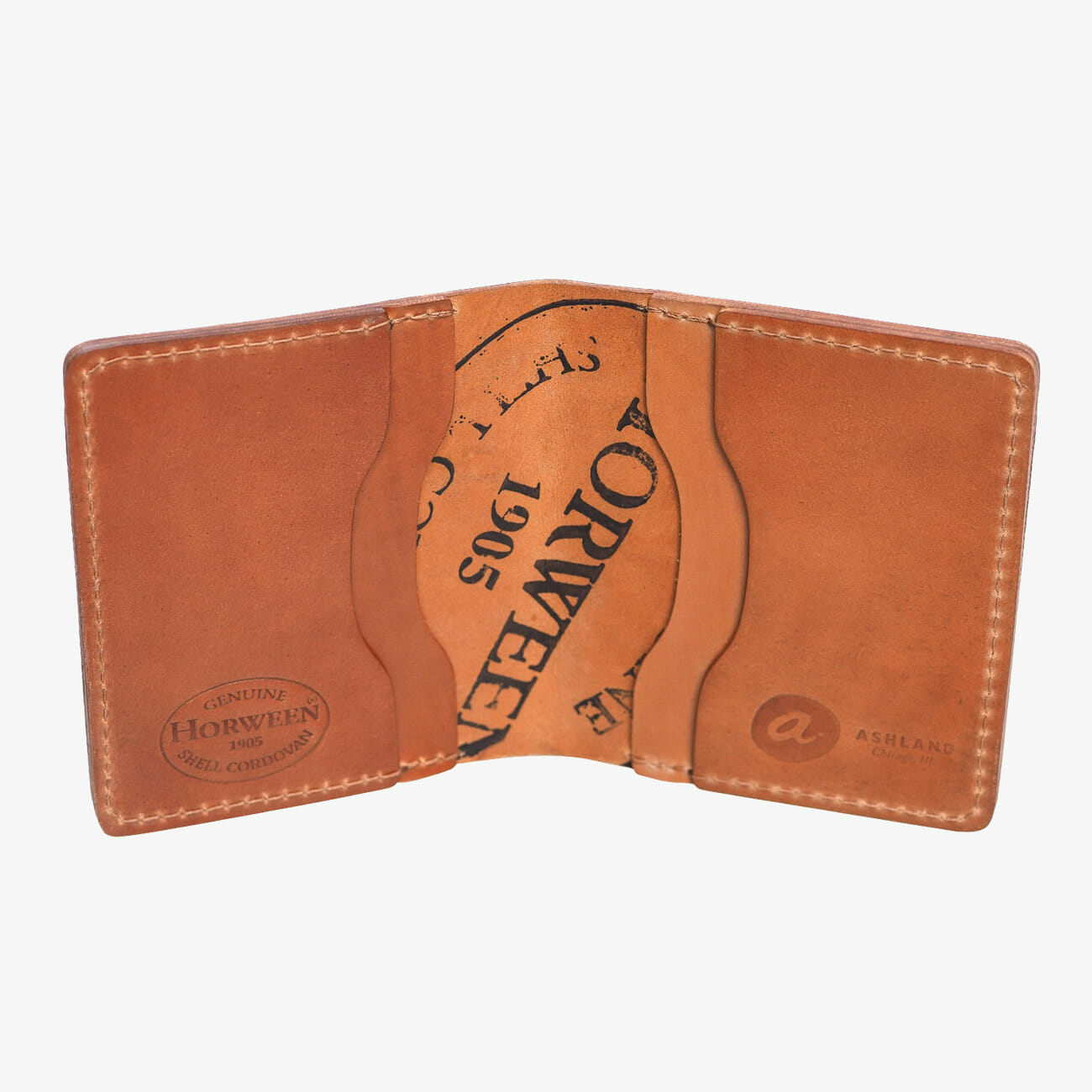 Chicago-based Ashland Leather Co. was founded by two tannery workers with over twenty years of combined experience. This card holder utilizes a natural Horween shell cordovan, a top-tier offering from the Chicago-based tannery. It has four interior card slots and one exterior bill pocket, and features the brand’s logo embossed on the inside.