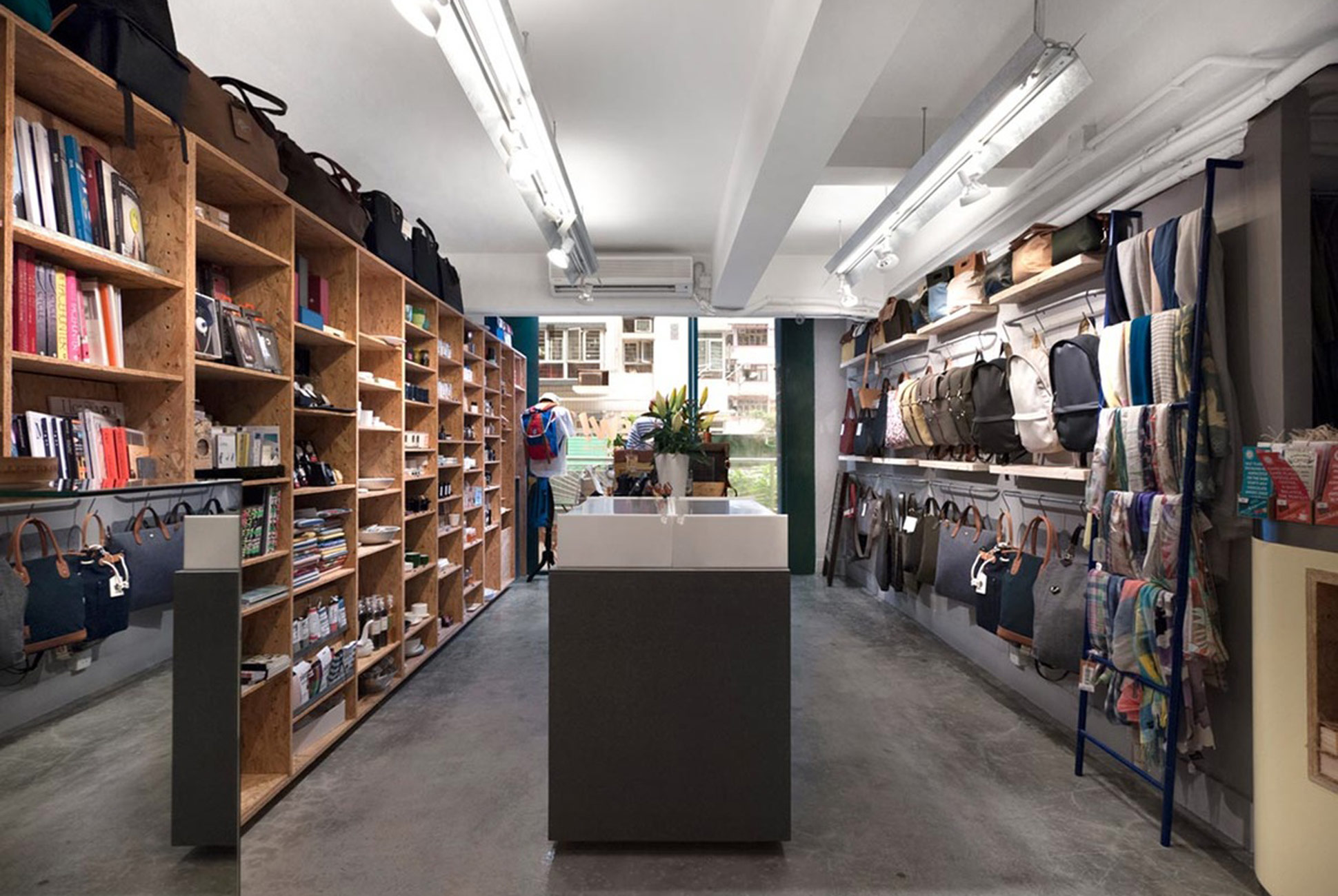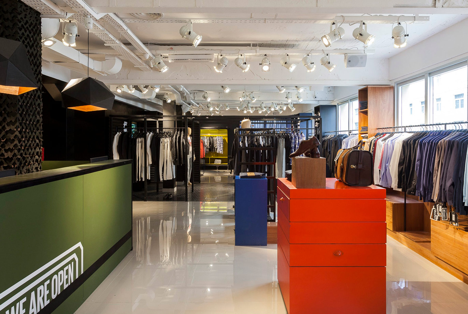 From left, clockwise: The spacious concrete floor at the Eureka Lab is painted for organizing seasonal collections; vats of nautral indigo, warmed with lamps, sit next to a row of washing machines; an employee chooses a thread cone for work on a prototype.