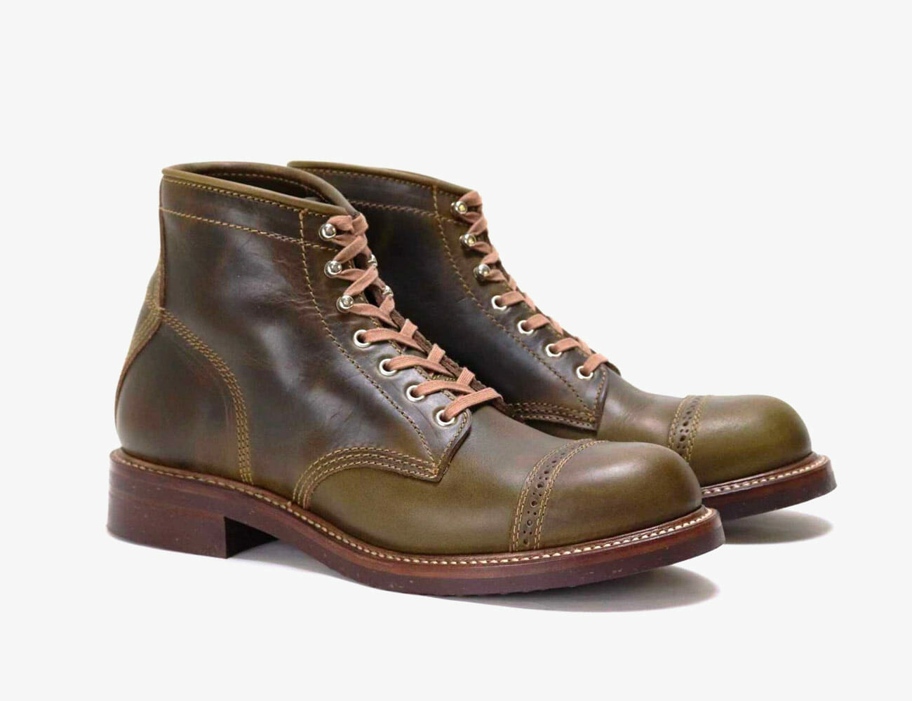 Made in Japan, these 6″ combat boots feature a Olive Chromexcel leather from Horween in Chicago. The Goodyear-welted cap-toe style features speedhooks, American-made brass eyelets and a Vibram 705 sole and 700 heel combination. Currently available for pre-order, these will ship in July.
