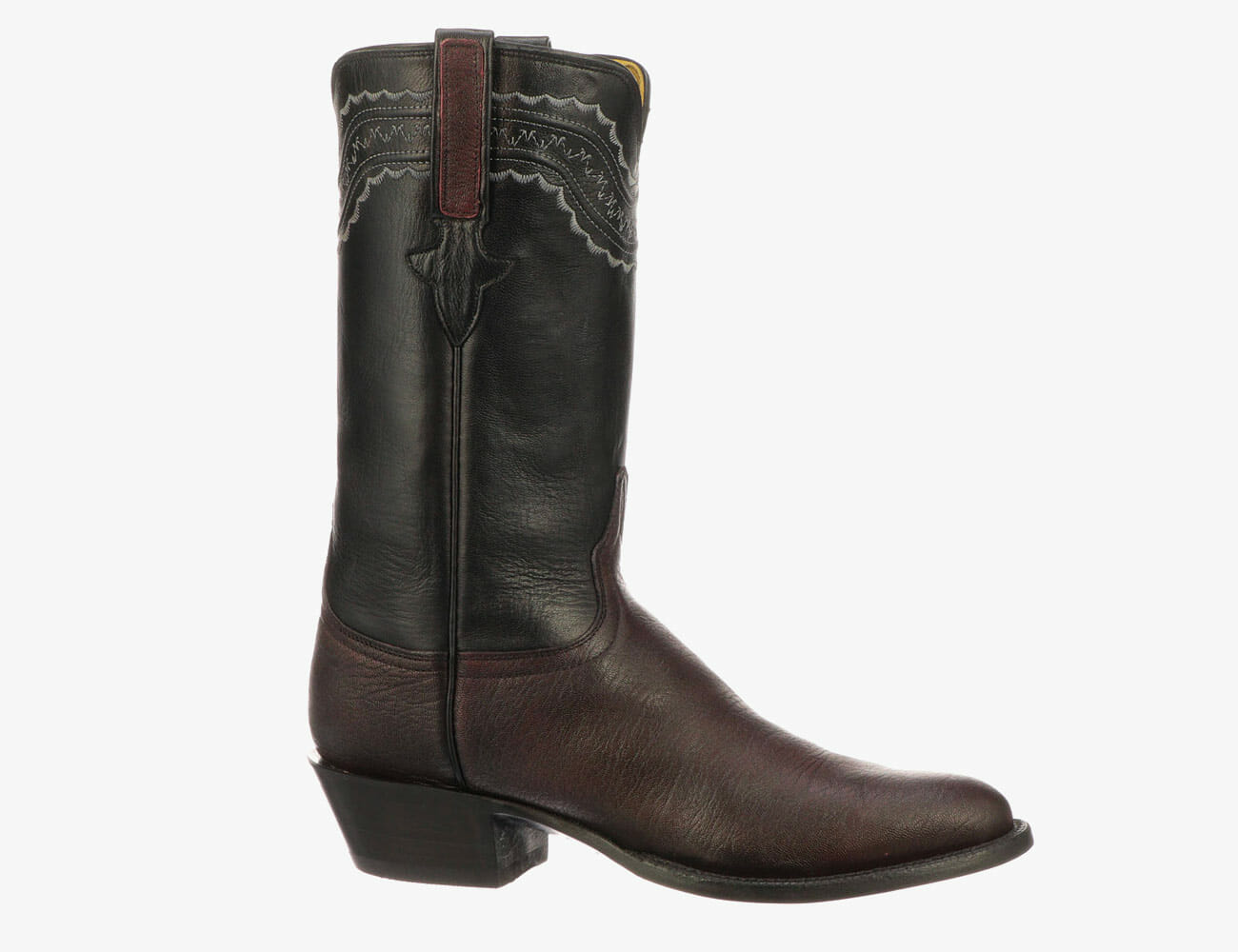 Made in Texas, these boots 12″ cowboy boots feature a black goat-leather shaft and an oxblood goat-leather vamp. The style has a leather sole, pull tabs and contrasting embroidery around the top of the shaft. It comes in sizes 5.5 to 16 and is available exclusively online.