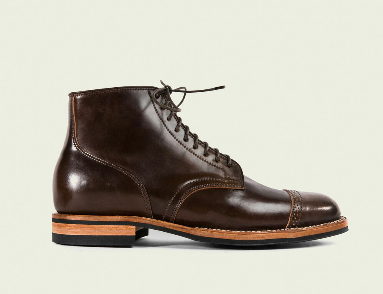 This spring, Viberg is offering its iconic Service Boot style in American shell cordovan. Based on a Canadian military boot, the Service Boot features nine blind eyelets, a Dainite sole, a leather lining and a natural leather midsole. These are a limited-production model and are available in sizes 6 through 13.