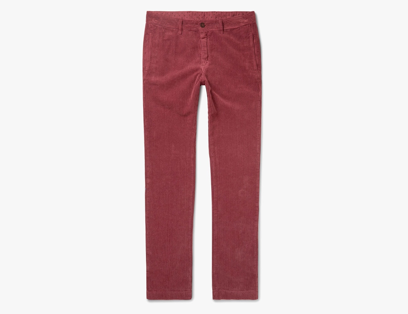 These Italian-made corduroy trousers sit comfortably between red and pink. The design is simple — four pockets and a zip fastening — and lets the wide-wale fabric speak of itself.