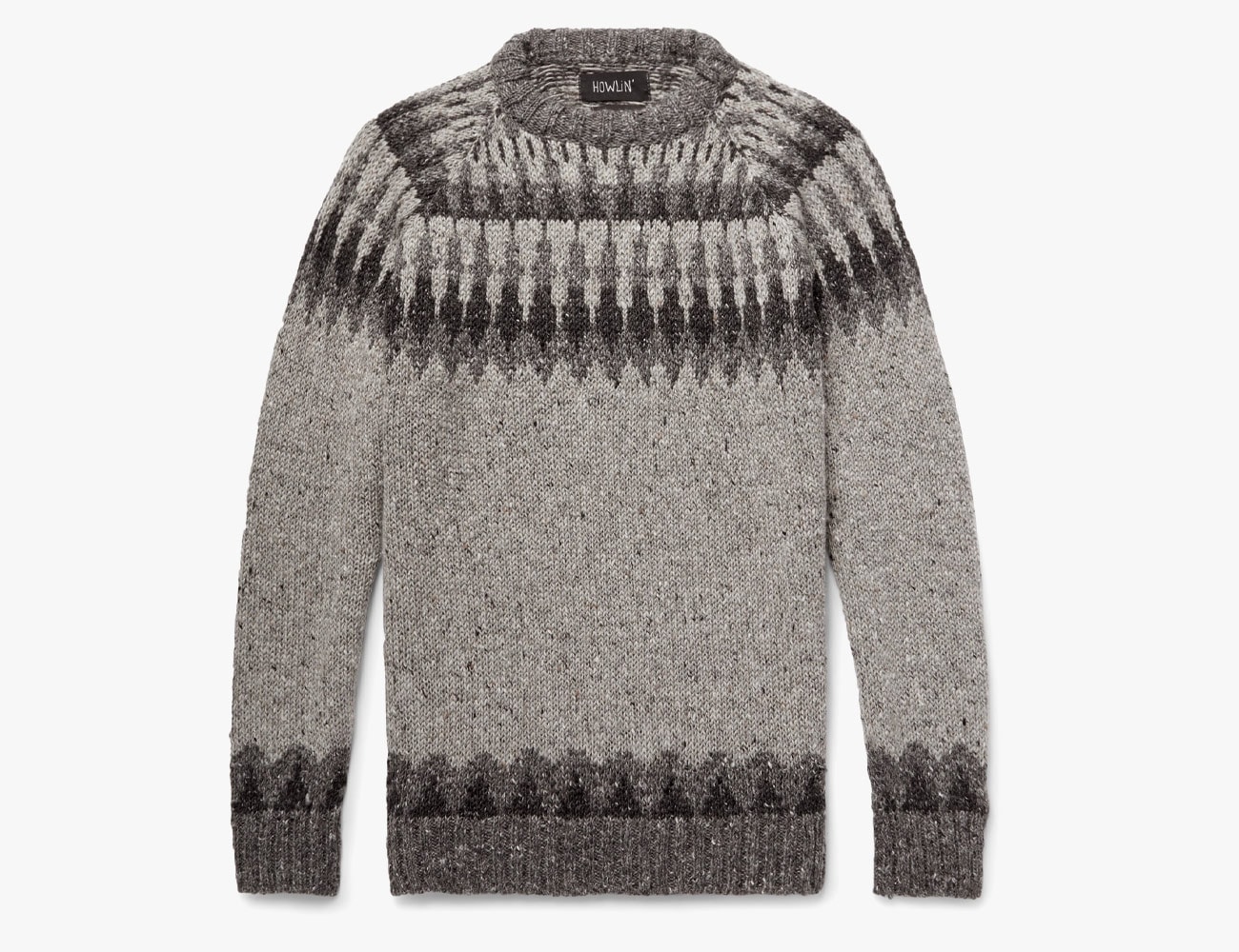 This traditional Fair Isle sweater is made with a 30 percent mohair blend that feels heavy. Made in Ireland, it features raglan sleeves and a ribbed hem and cuffs.