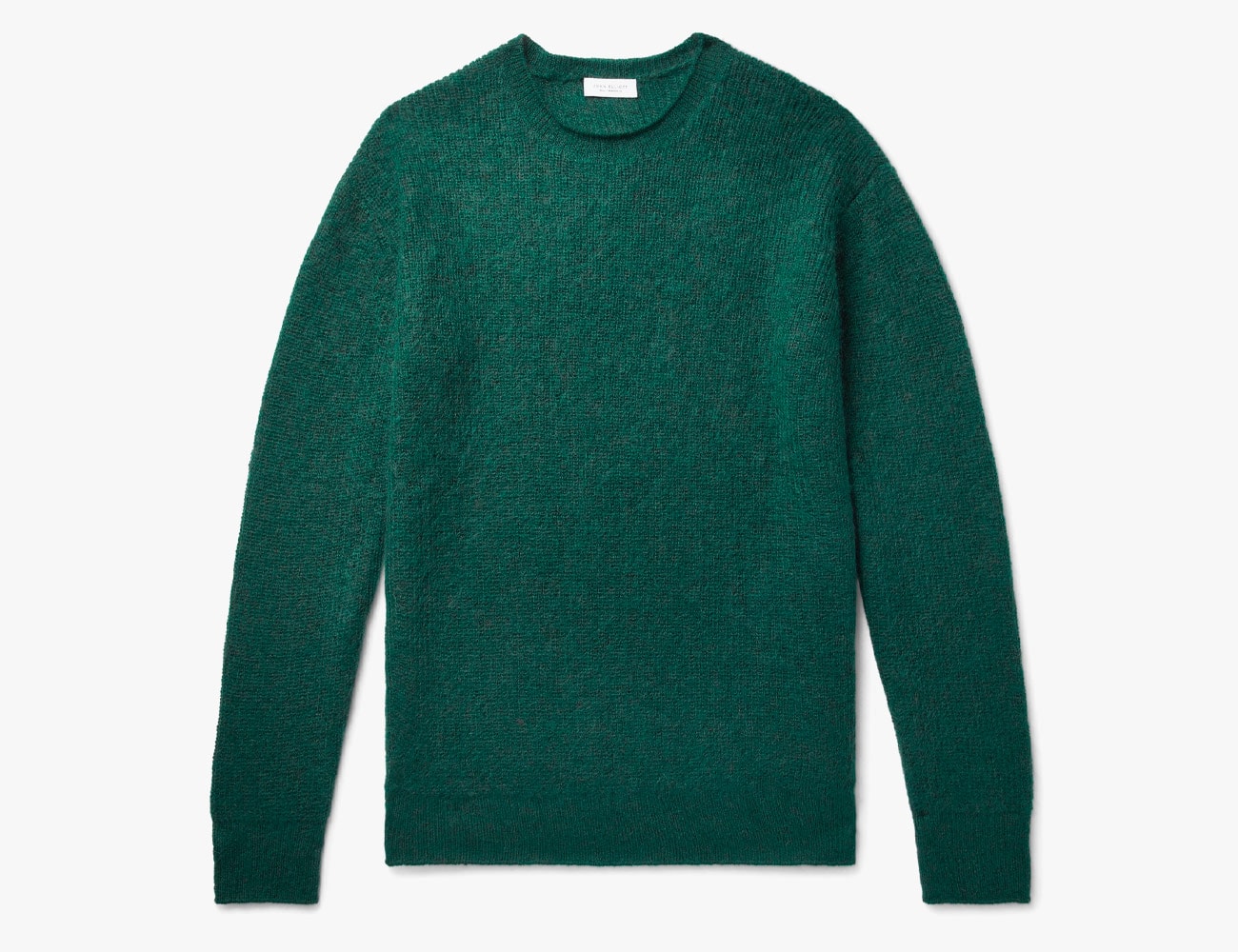 This emerald sweater is knit with a 65-percent mohair blend. The green color feels rich and distinct, and the sweater features a classic fit, and a ribbed neck, hem and cuffs.
