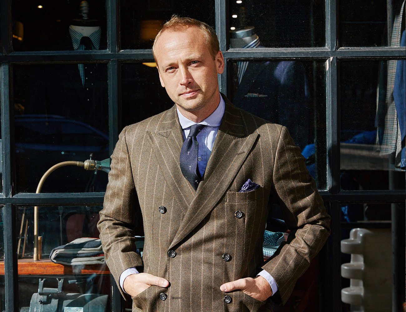 You’ll need to know your waist, chest and shoulder measurements, as well as the length of your arms. The sleeves of a blazer should finish around 1/2” short of your hand and sit 1-2” above the top of your thigh when you’re standing. Look out in particular for the fit around the collar, button area and shoulders – all of these places show the obvious signs that a blazer is too loose or too tight.
