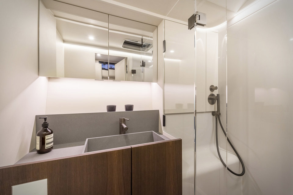 Custom six-blade propellers minimize noise and vibration as it maximizes performance. Moreover, you’ll find a wastewater-recycling system onboard, which filters and refreshes water for use in technical systems.