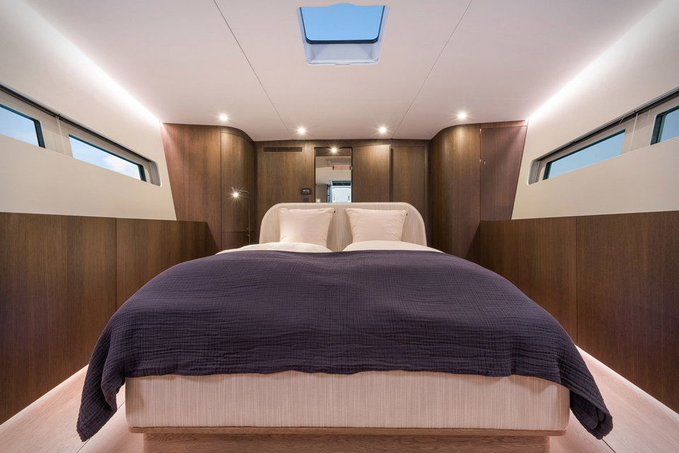 Designed with the outdoor lifestyle in mind, the LeVen 90 boasts a nearly 40-foot-long sundeck, with expansive bow seating, plus a huge rear Opacmare Transformer swim deck for launching kayaks or jet skis. You also get full-width doors that open up the main salon to the rear lanai deck, which Silva calls The Great Room. And instead of the forward end of the cabin transforming into a helm station, Silva uses it as an open space, full-width eat-in galley. With huge central island and bar stools, to boot.