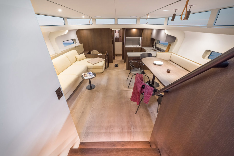 At just 29 tons, this is one of the more lightweight yachts we’ve seen. But make no mistake — this thing packs heft, with nearly 300 square meters of sail area. This allows the boat to move on wind power when other similarly sized yachts are still running their engines.
