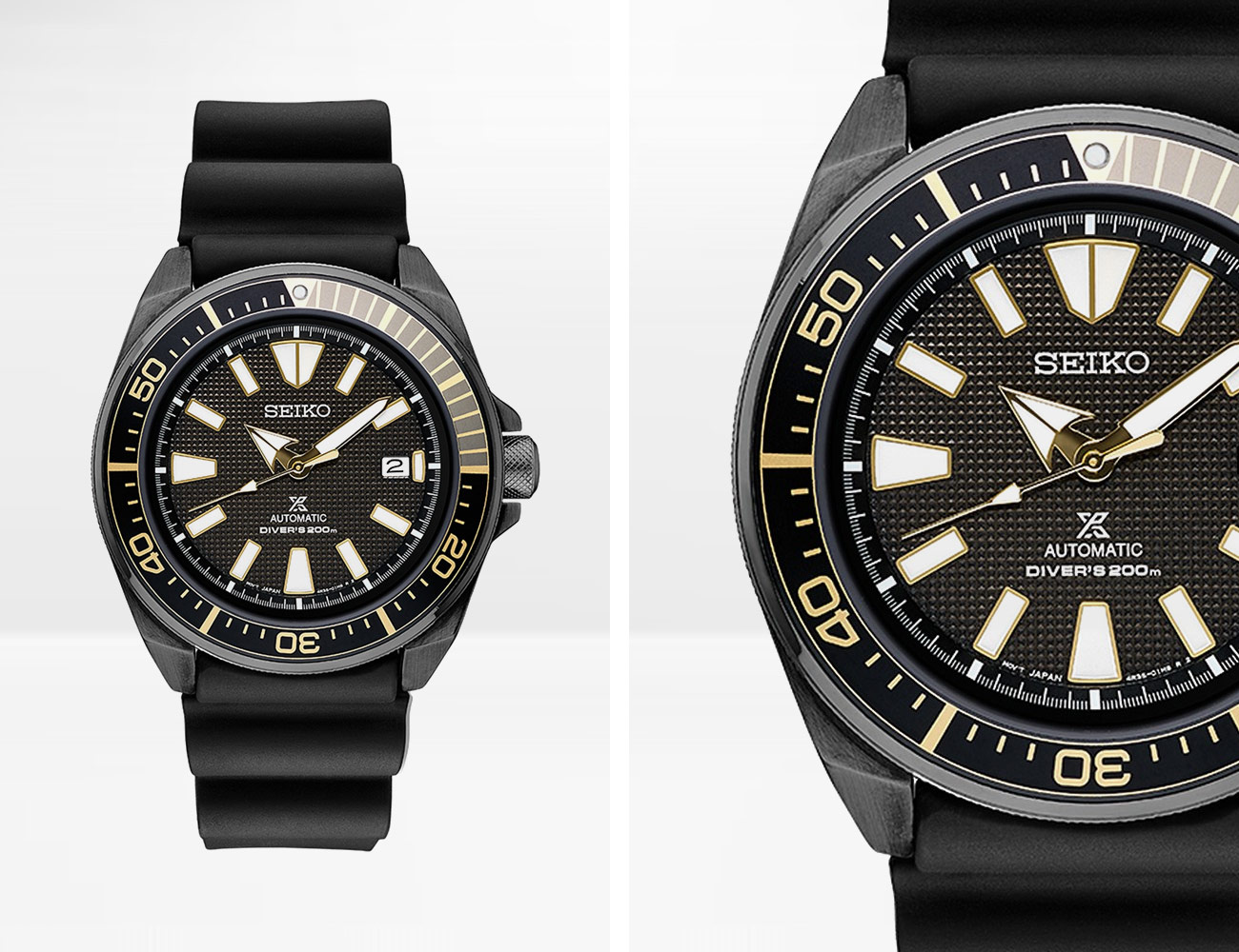 Seiko’s edgy “Samurai” diver is certainly a watch deserving of a sinister-looking colorway. The sculpted case gets black ion-plating, the textured dial is done up in black, and it’s mounted to a black rubber strap. The gold accents on the bezel add enough contrast for the count-up bezel to be legible.