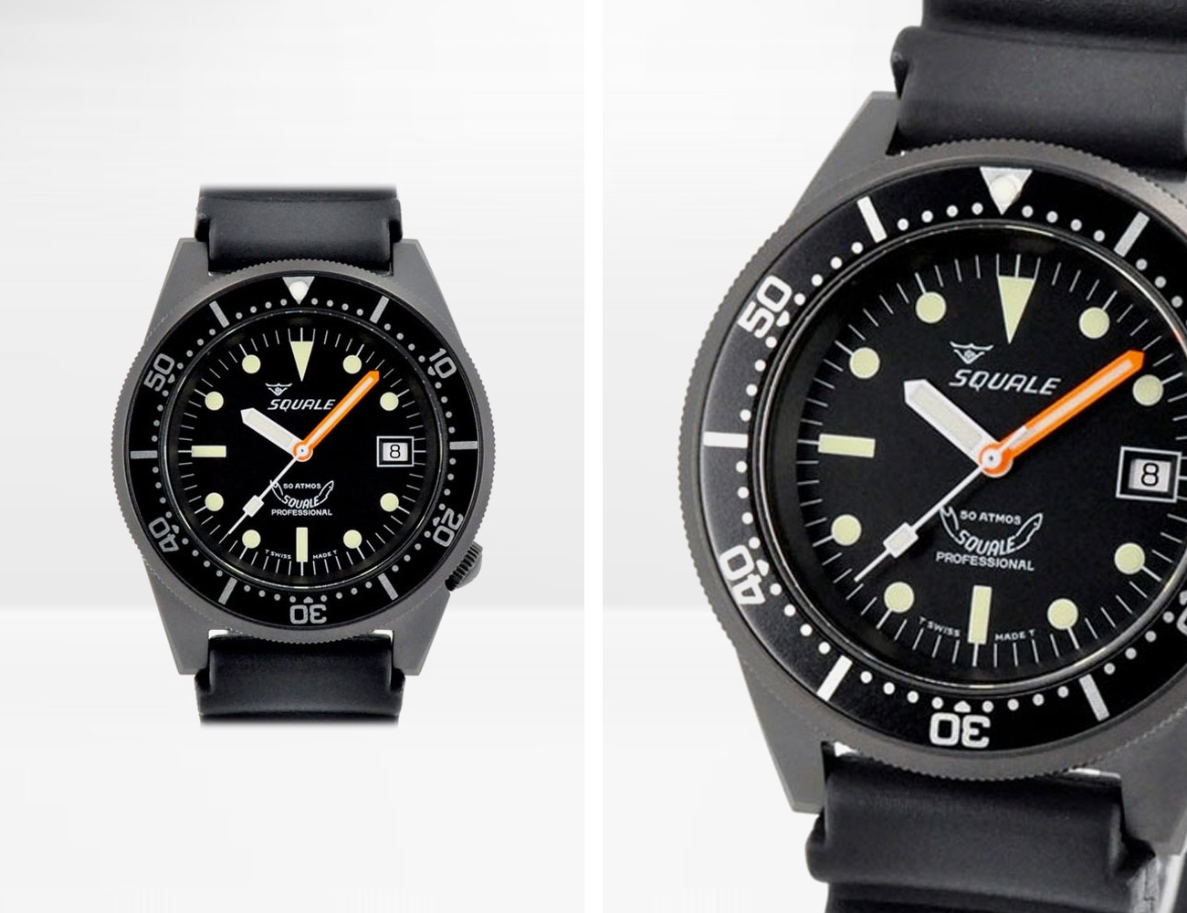 Squale was once a watch-case producer (associated with Blancpain, Heuer and Blancpain, among others) that relaunched in the 21st century as a maker of retro-inspired dive watches. This 50 Atmos is, as the name suggests, water-resistant to 500 meters (50 atmospheres) and powered by a Swiss-made ETA automatic. The black PVD coating suits the sleek case shape of the 50 Atmos well, and the orange minute hand is a nice touch.
