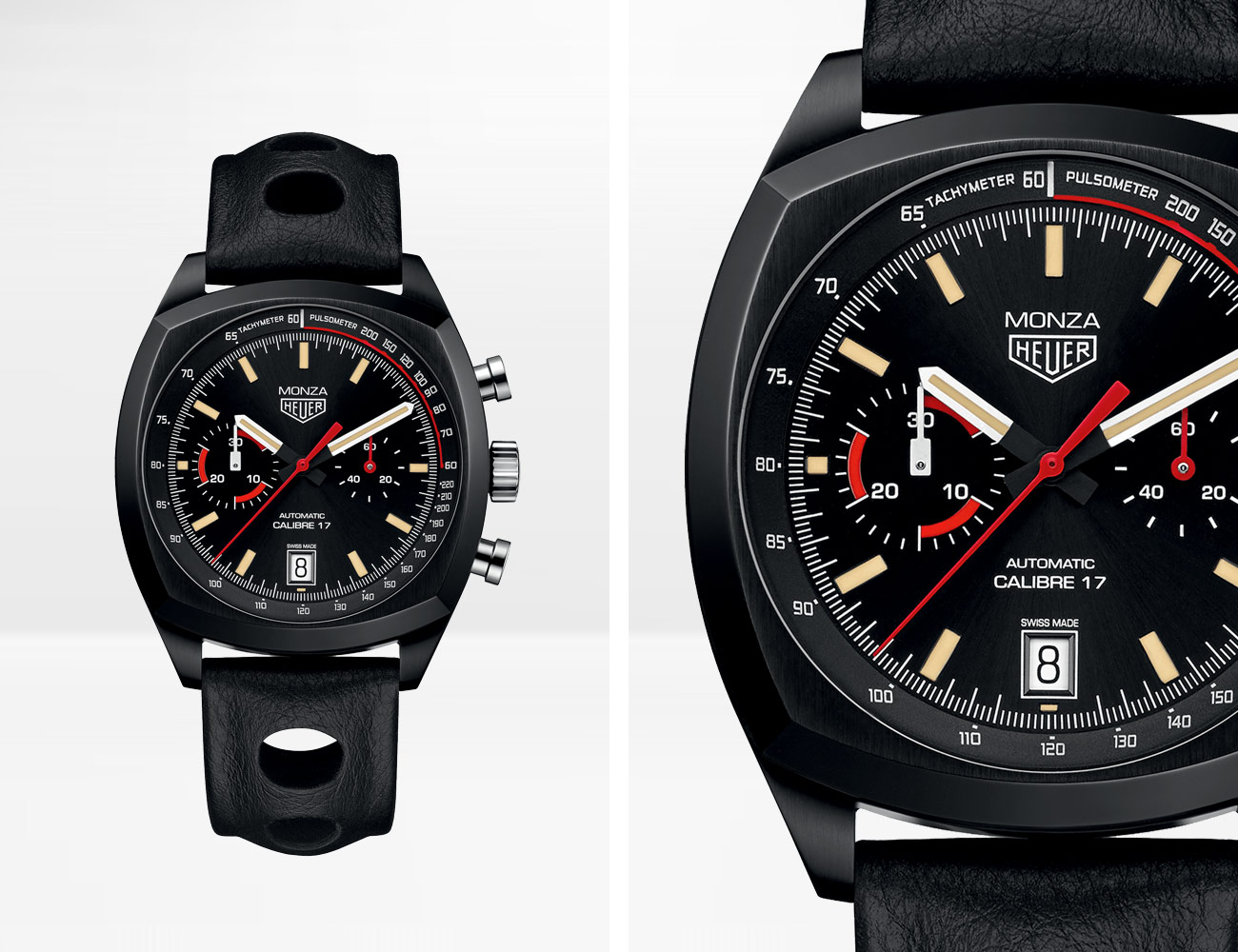 Jack Heuer released the Monza in 1976 as a celebratory gift to Ferrari for winning the 1975 F1 World Championship (Ferrari driver Niki Lauda sealed the deal at Ferrari’s home turf at Autodromo Nazionale Monza). The original Monza had a PVD-coated stainless steel case, and was one of the earliest watches with an all-black design. This modern reissue eschews PVD-coated stainless steel in favor of a titanium case with titanium carbide coating.