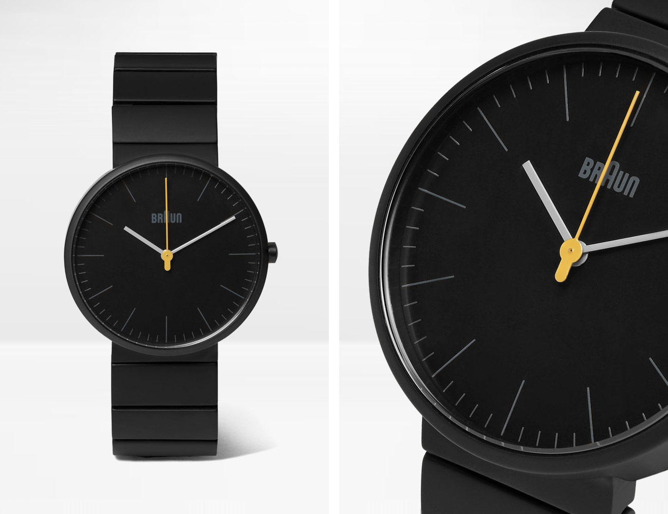 Ceramic cases are usually reserved for the top of the haute-horologerie food chain (see the end of this list, for example), but that didn’t stop Braun from offering one in a sub-$500 package. The black case and bracelet are mated with a black dial with subtle gray hour markers, with just the white and yellow hands providing the only contrast against a stunningly dark void.