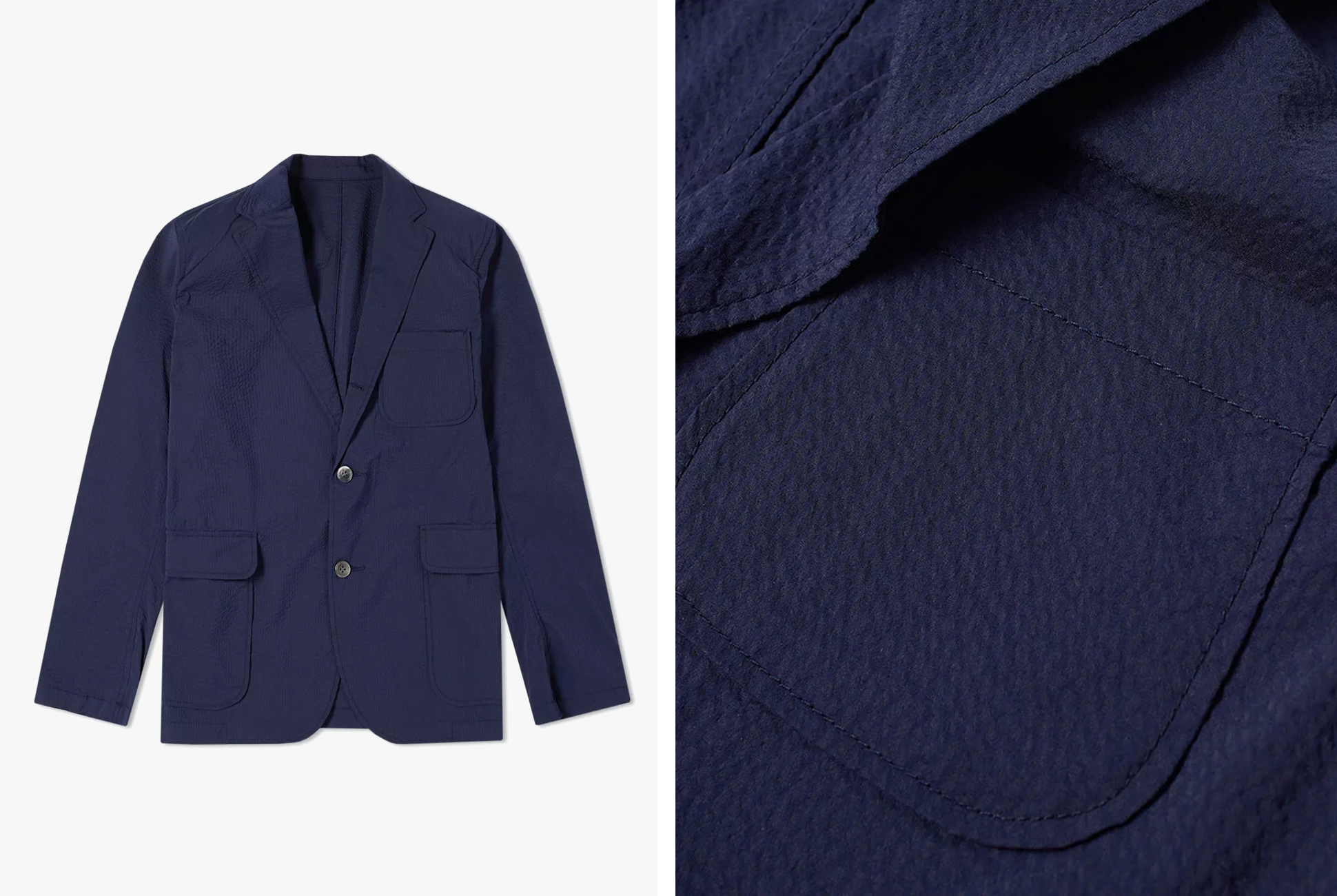 Made in Japan, this blazer is cut from a cotton-poly lightweight seersucker fabric. It features a notched lapel, three pockets and a three-button closure.