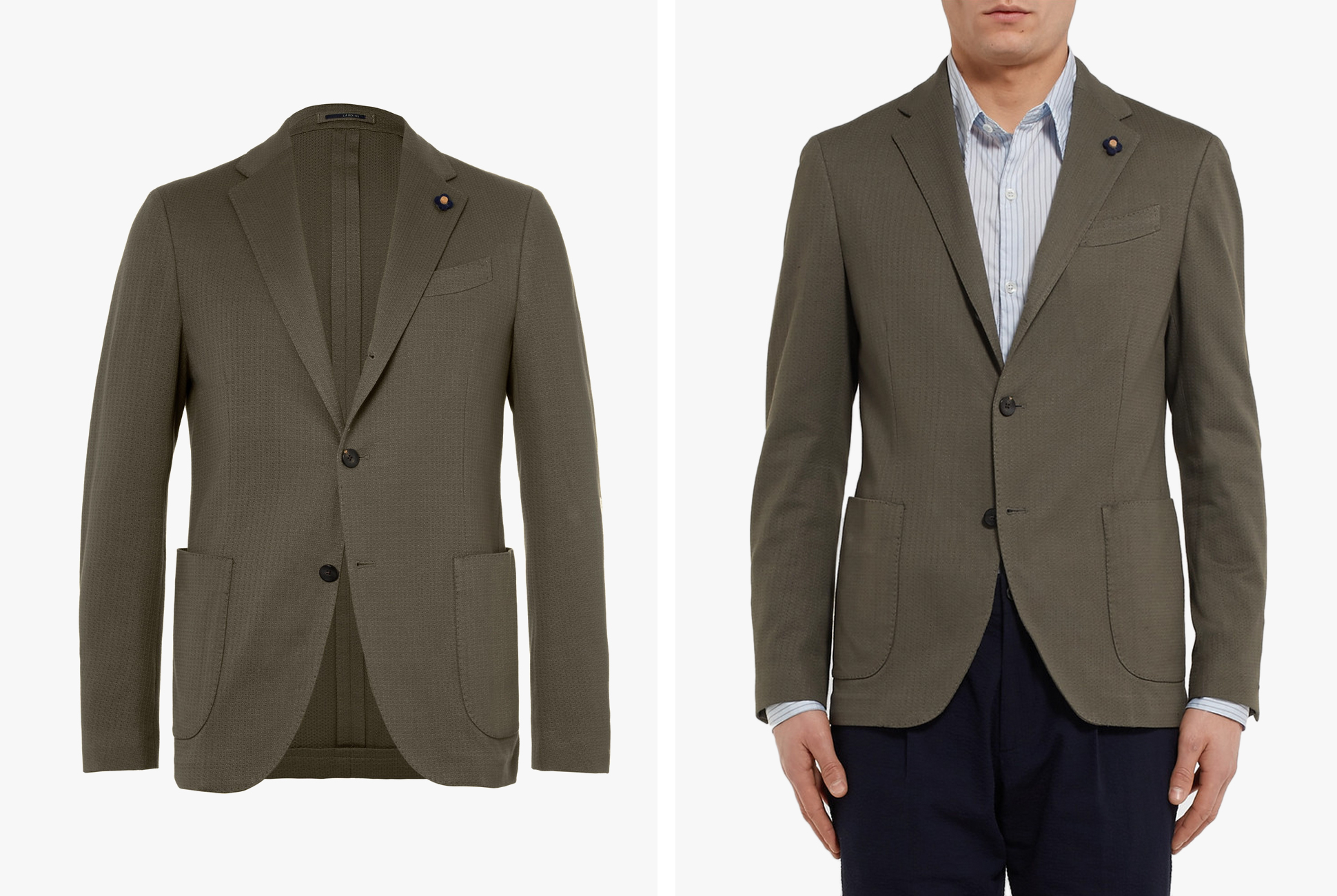 The cotton used here is woven to be naturally breathable, giving the blazer a distinct texture. The design features notch lapels, a felted undercollar, a double vent and buffalo horn buttons.