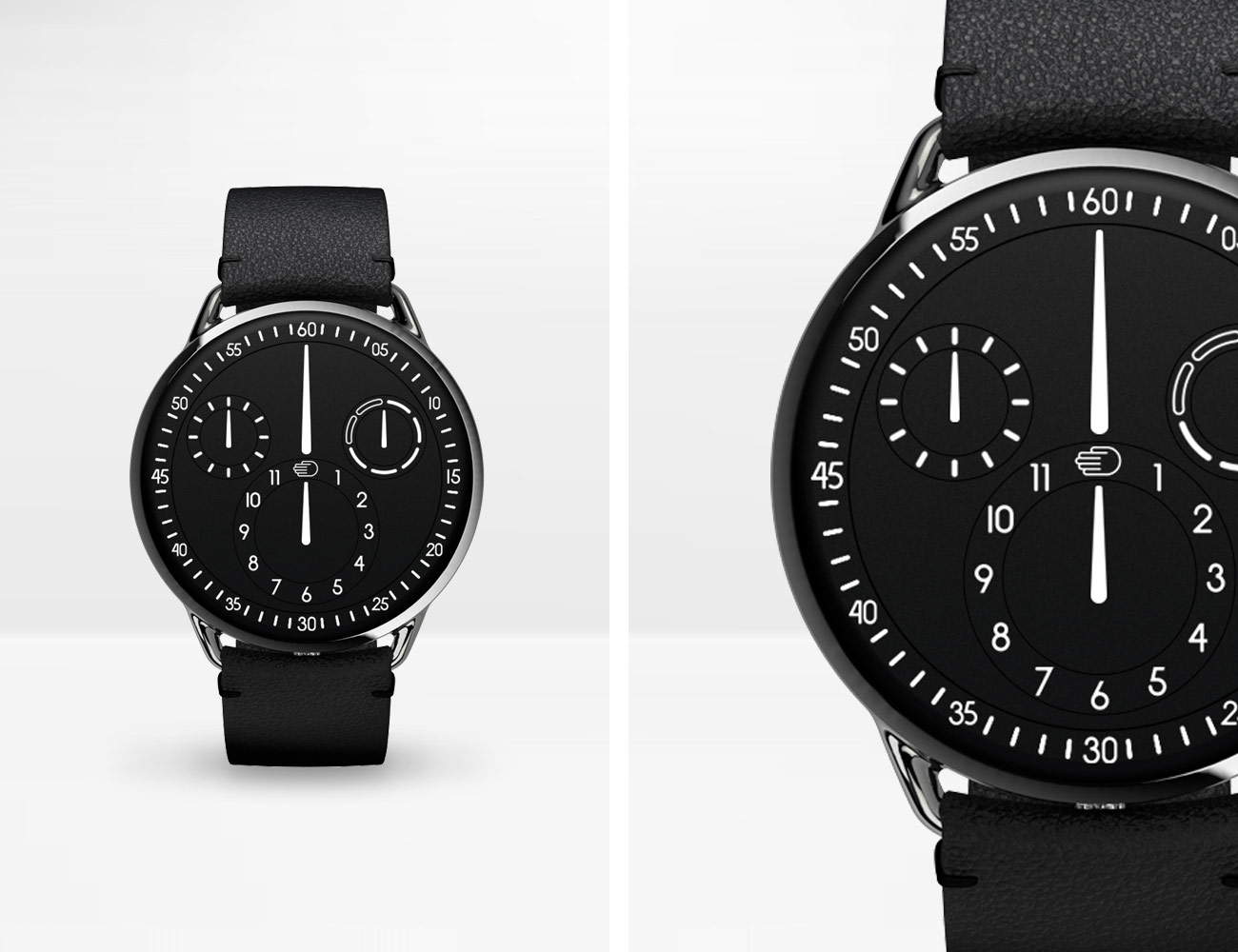 A high-tech material like Titanium Grade 5 is a very fitting choice for such a forward-thinking timepiece like the Ressence Type 1. It features a mechanical movement moving a set of orbiting discs that make up the dial, tracking seconds, minutes, hours and days of the week.